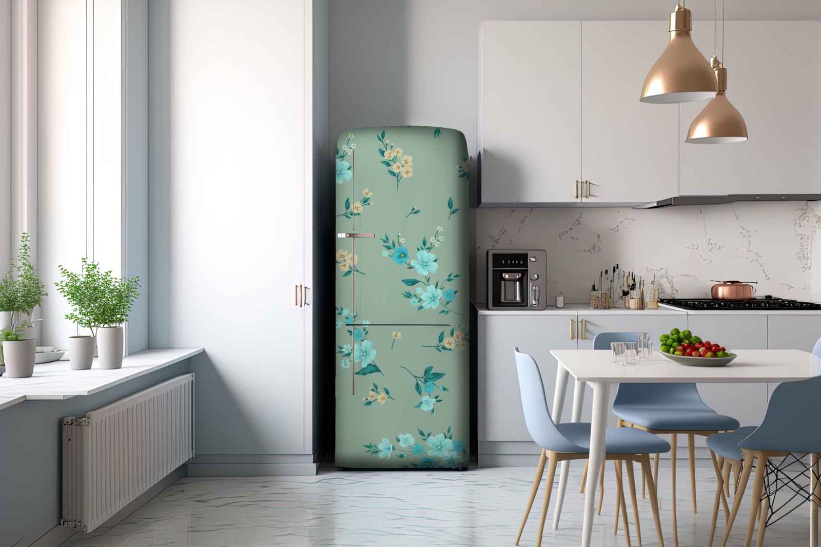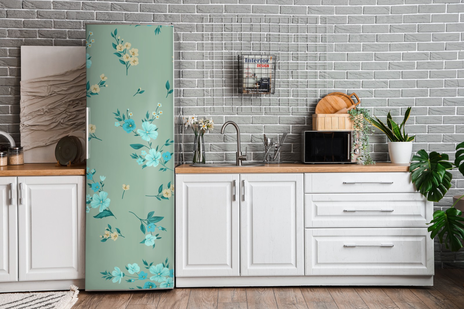 Kühlschrankaufkleber pastell türkis blumenmuster auf salbeigrünem hintergrund