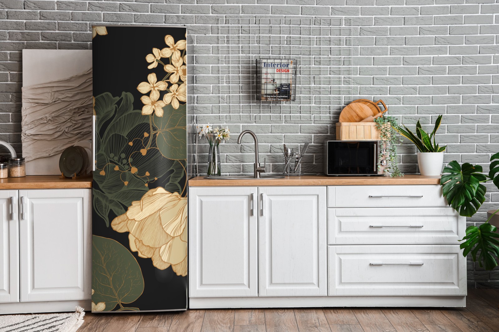 Kühlschrankaufkleber goldene pfingstrosen vor dunklem botanischem hintergrund