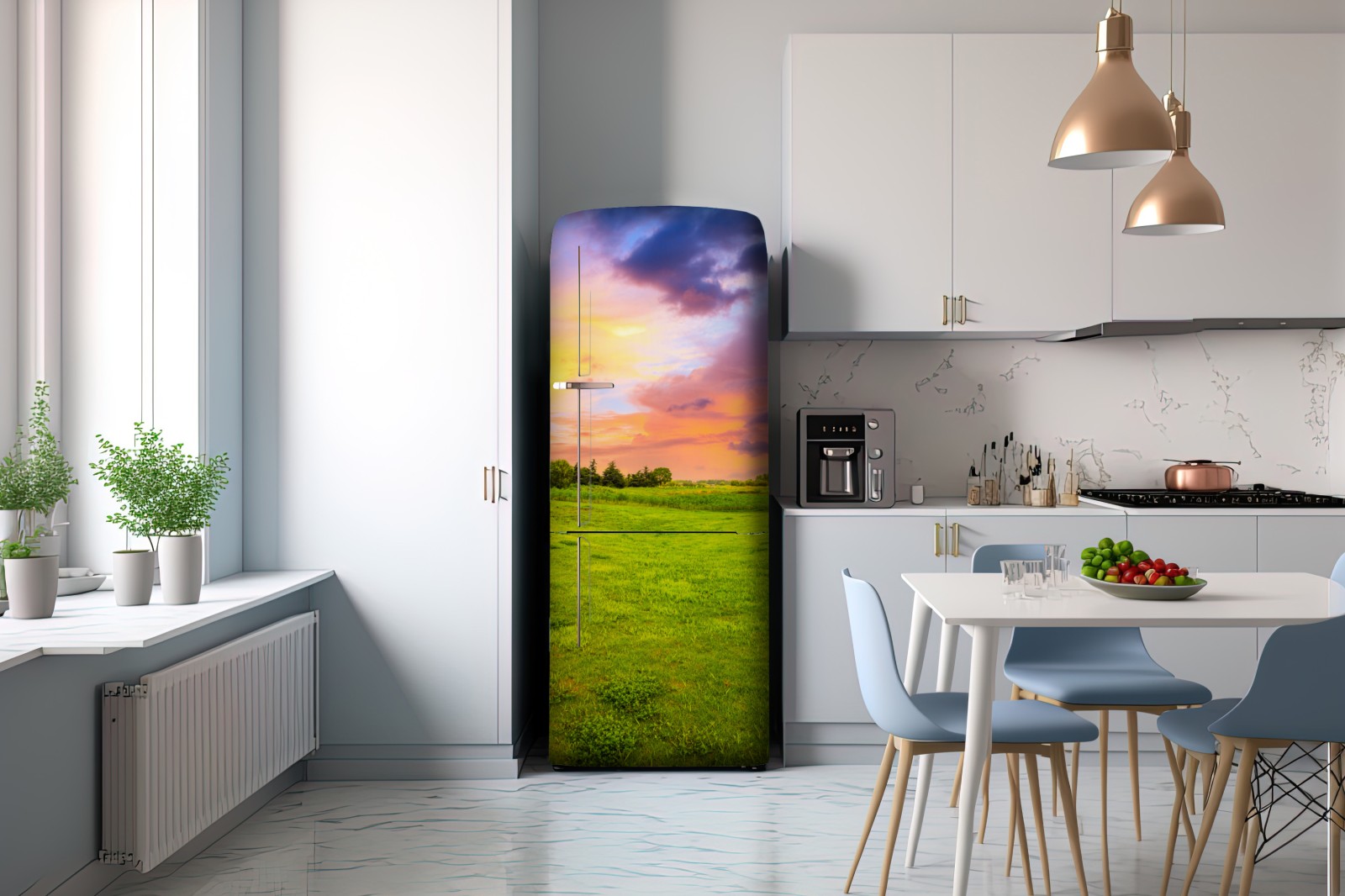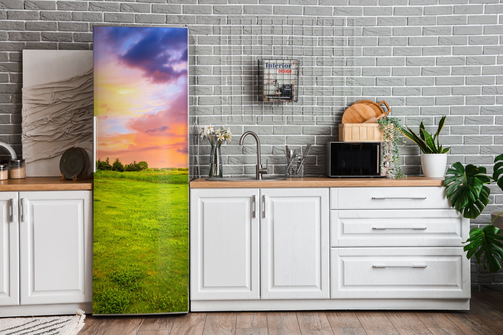Kühlschrankaufkleber sonnenuntergang über grüner wiese