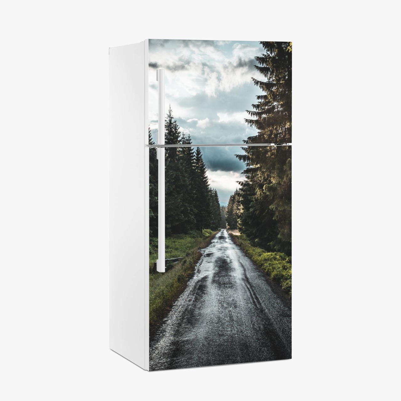 Kühlschrankaufkleber Waldweg durch neblige kiefern