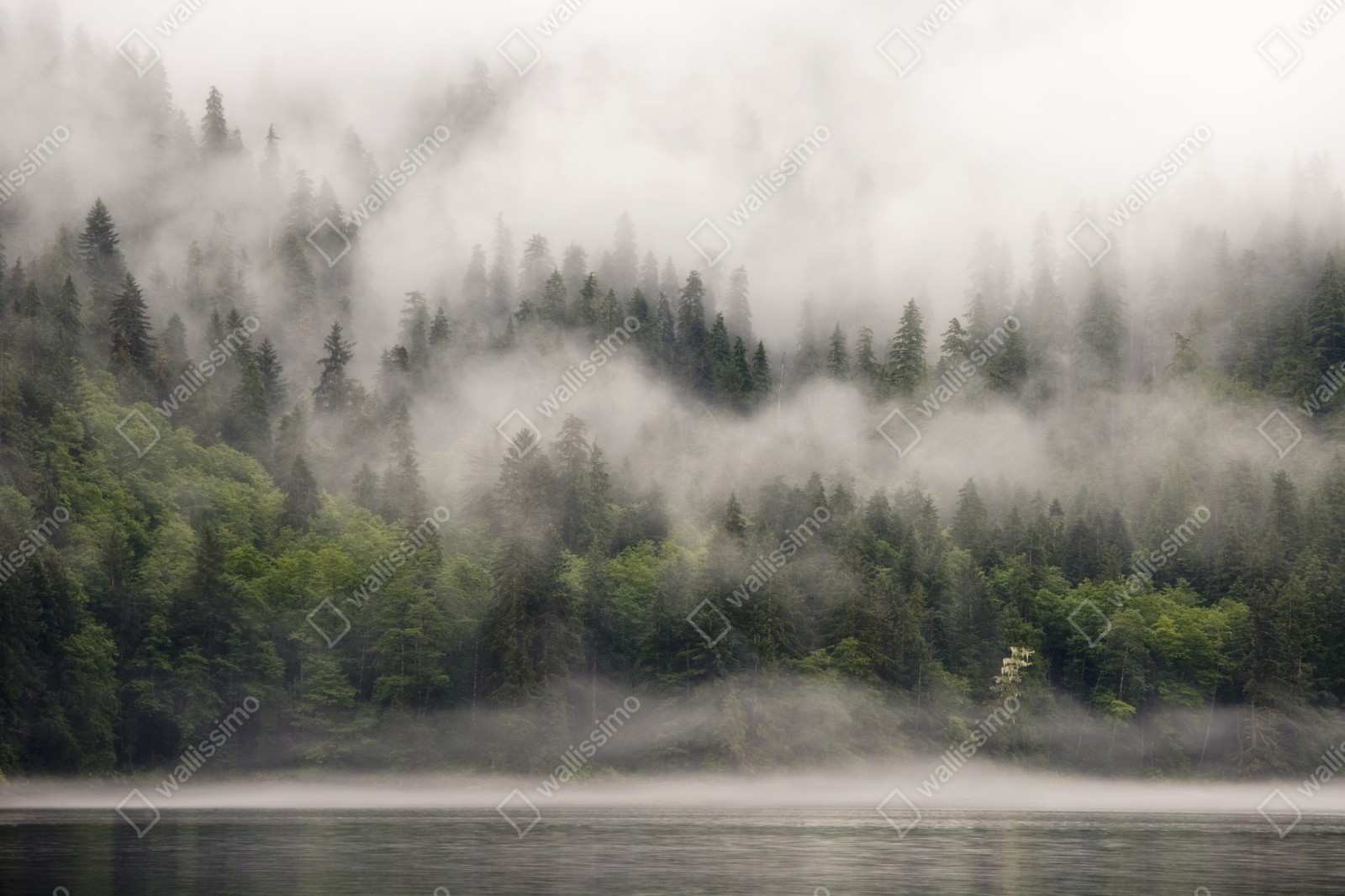 Eine beruhigende nebelige Waldlandschaft an einer Küstenbucht in British Columbia, perfekt, um natürliche Ruhe in Ihr Zuhause zu bringen.
