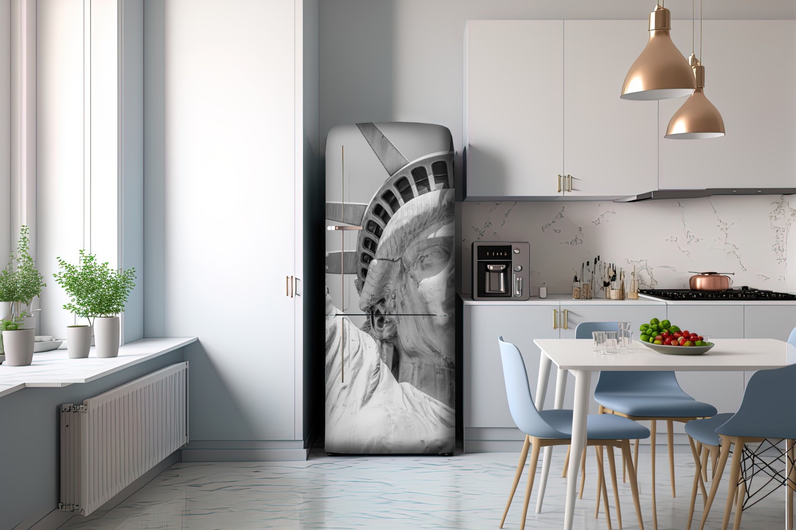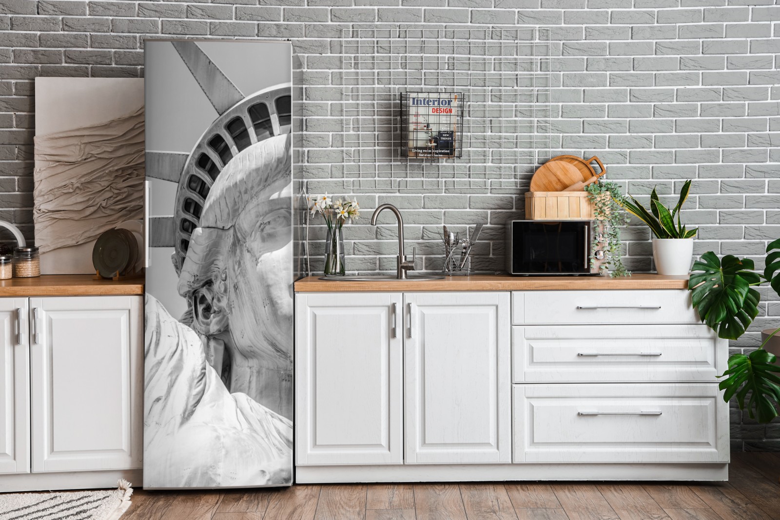 Markante Schwarzweiß-Nahaufnahme der Freiheitsstatue, die architektonische Details und zeitlose Symbolik in moderne Innenräume bringt.