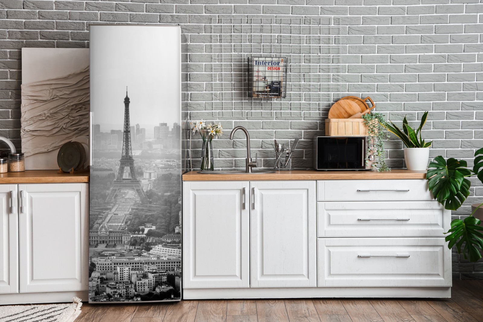Kühlschrankaufkleber elegante Eiffelturm luftaufnahme in graustufen