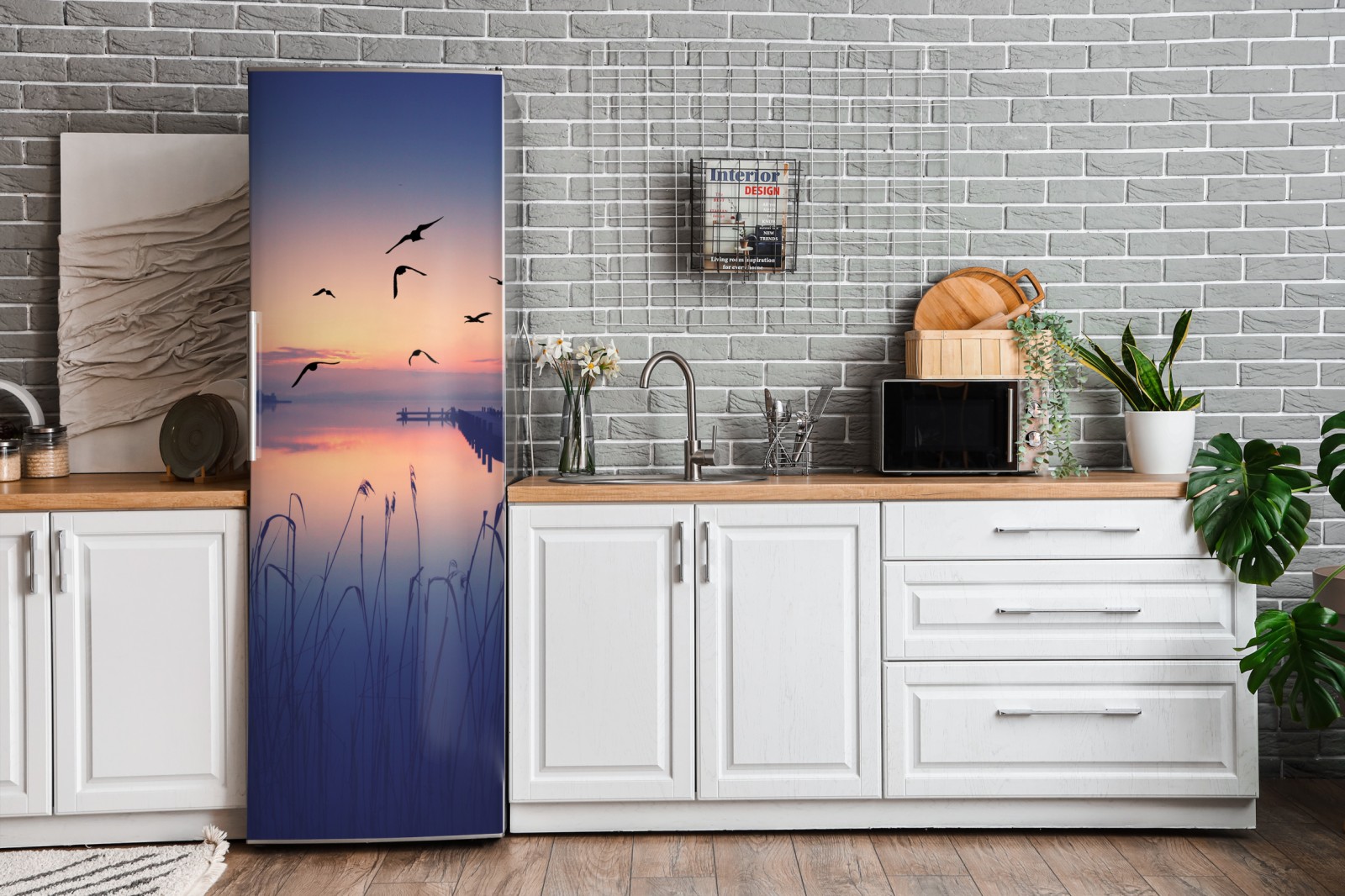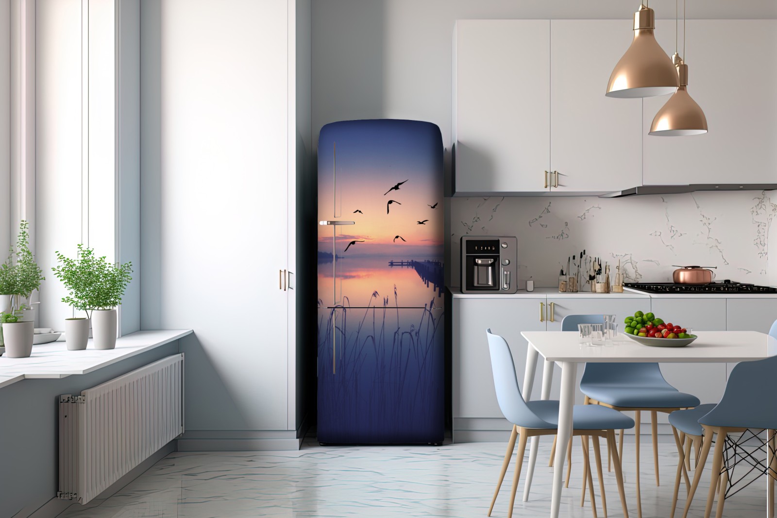 Kühlschrankaufkleber ruhiger sonnenaufgang am see mit vögeln