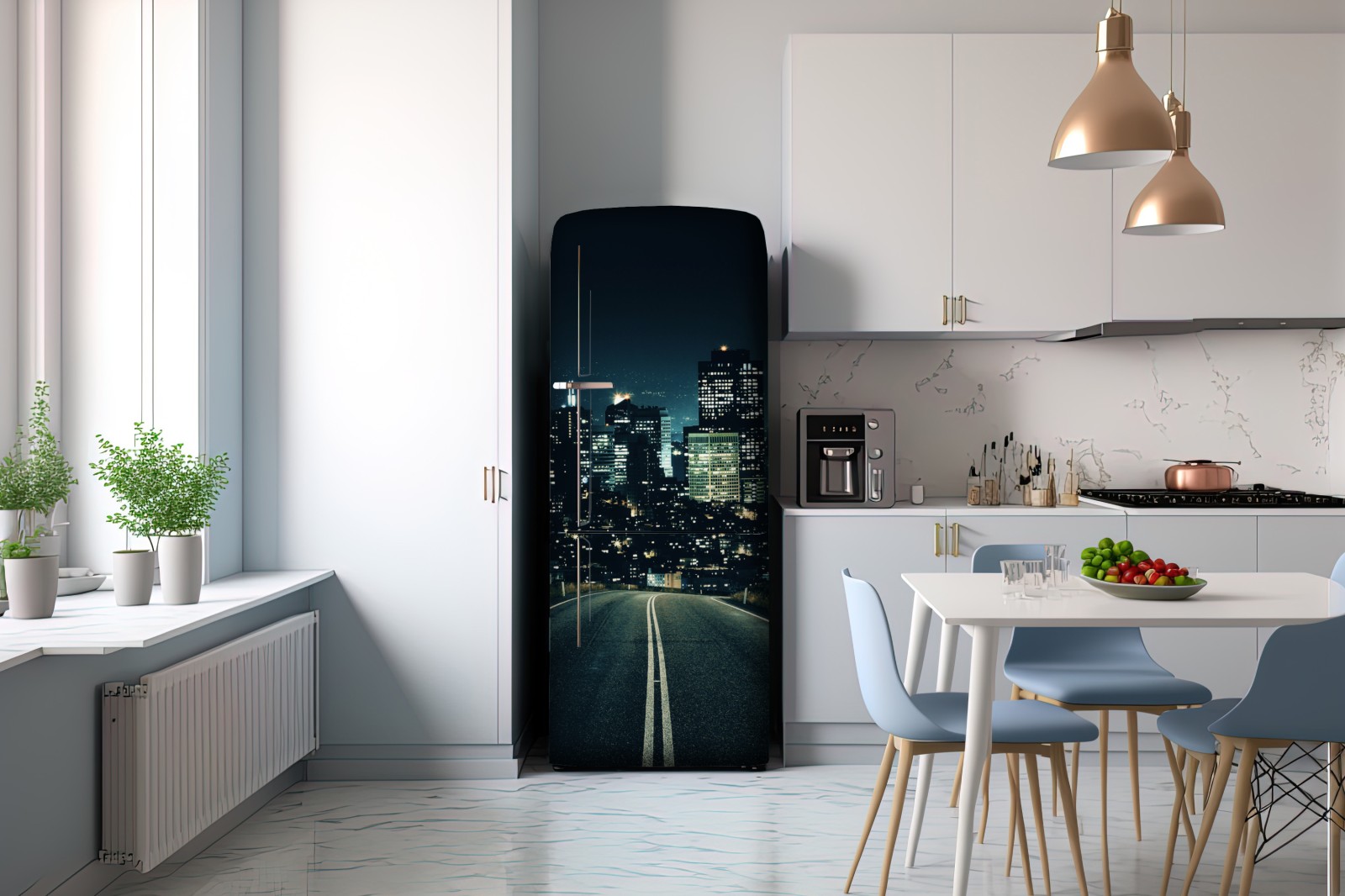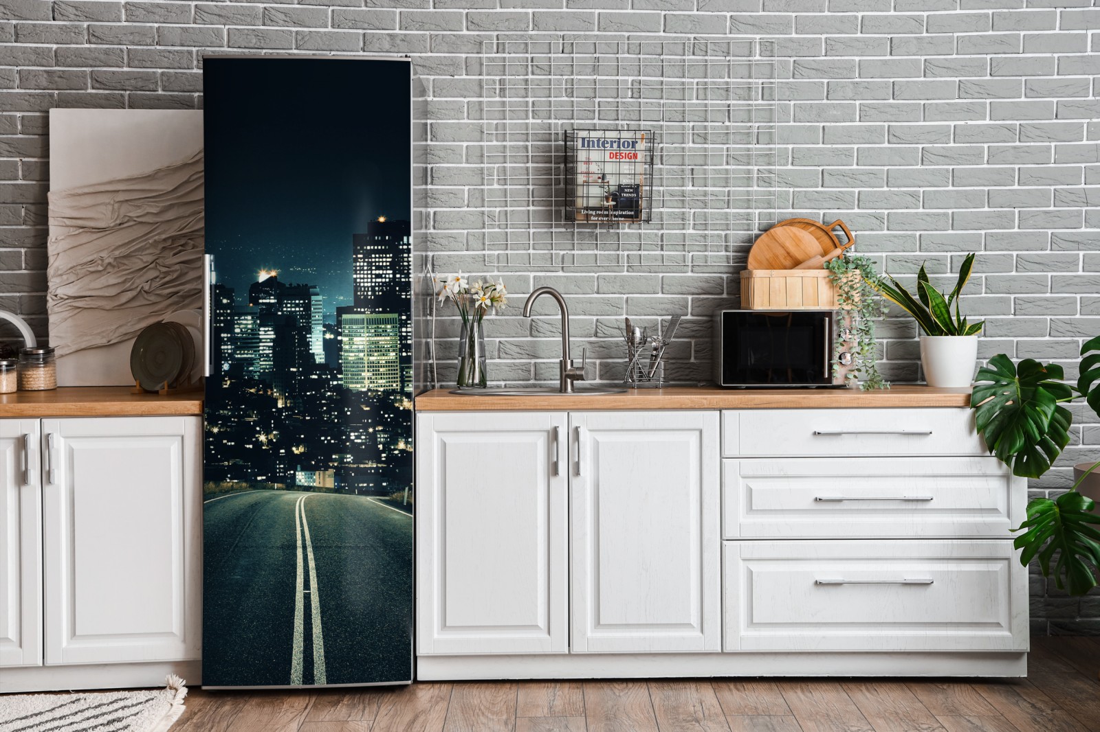 Kühlschrankaufkleber straße zur beleuchteten stadtsilhouette bei nacht