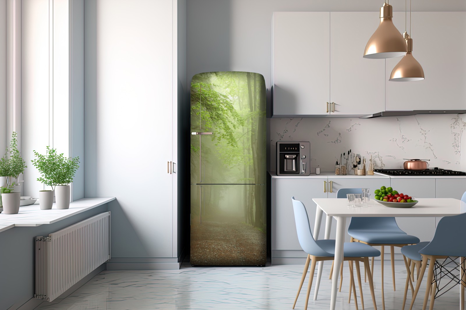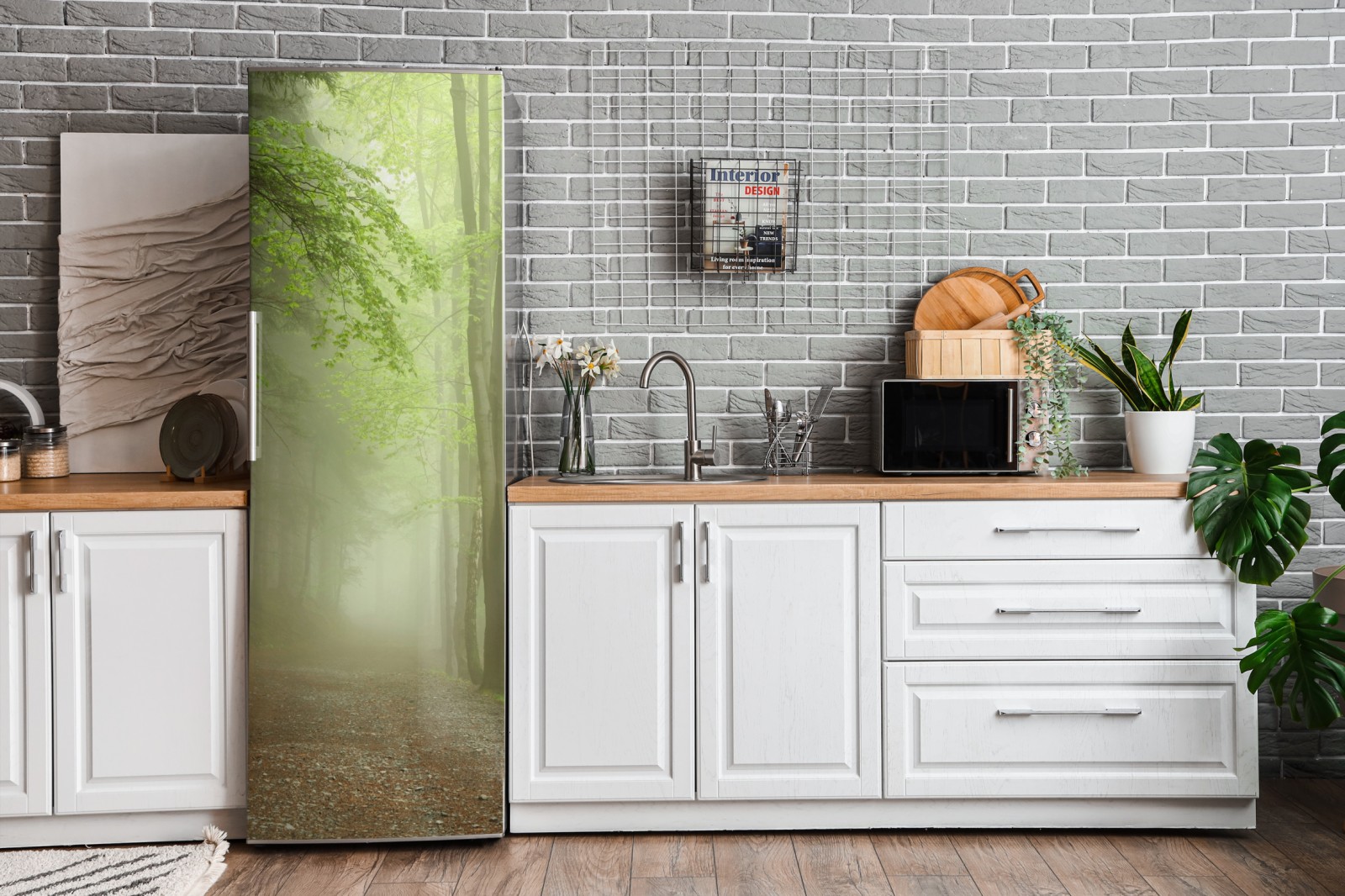 verleihen sie ihrem raum eine ruhige atmosphäre mit diesem nebligen waldpfad, der üppiges grünes laub, schlanke birkenstämme und sanften morgennebel zeigt.