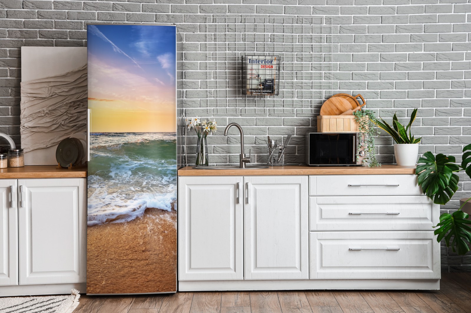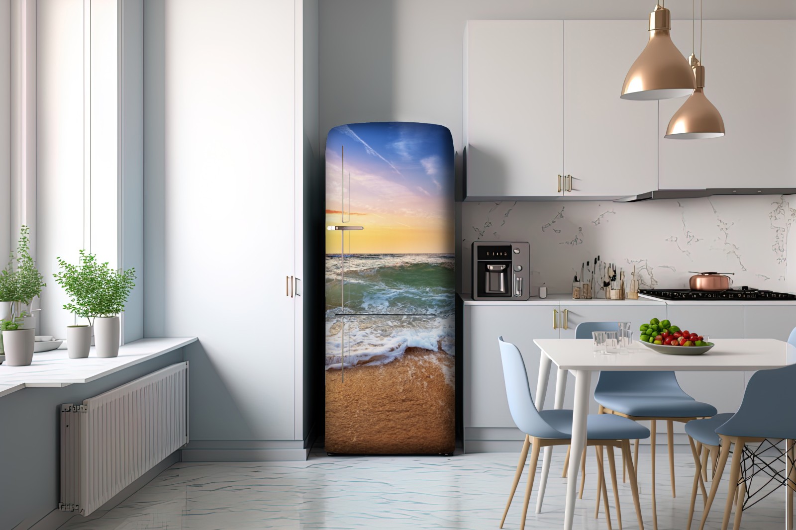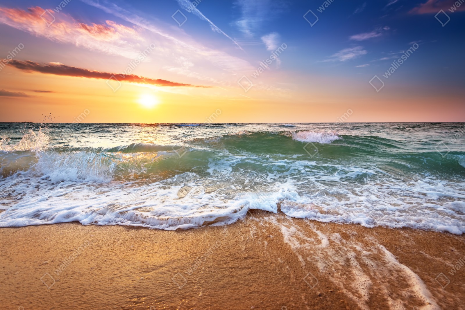 Kühlschrankaufkleber goldener sonnenuntergang am strand mit sanften wellen