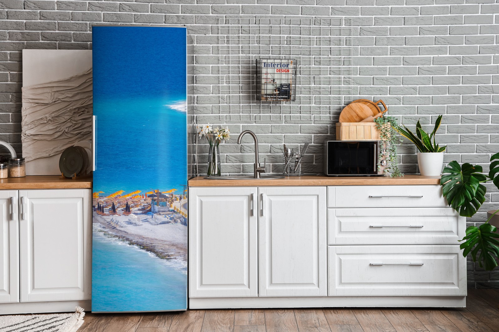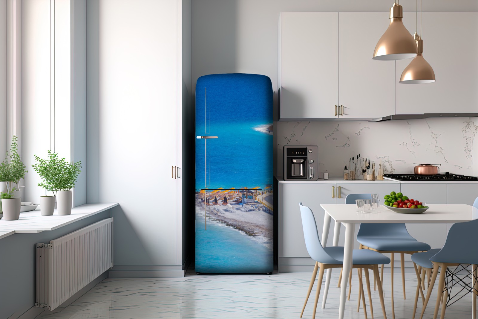 Bringen Sie das leuchtende Blau von Rhodos in Ihr Zuhause mit diesem ruhigen Küstenmotiv, das türkisfarbenes Wasser und sonnige Sonnenschirme zeigt.