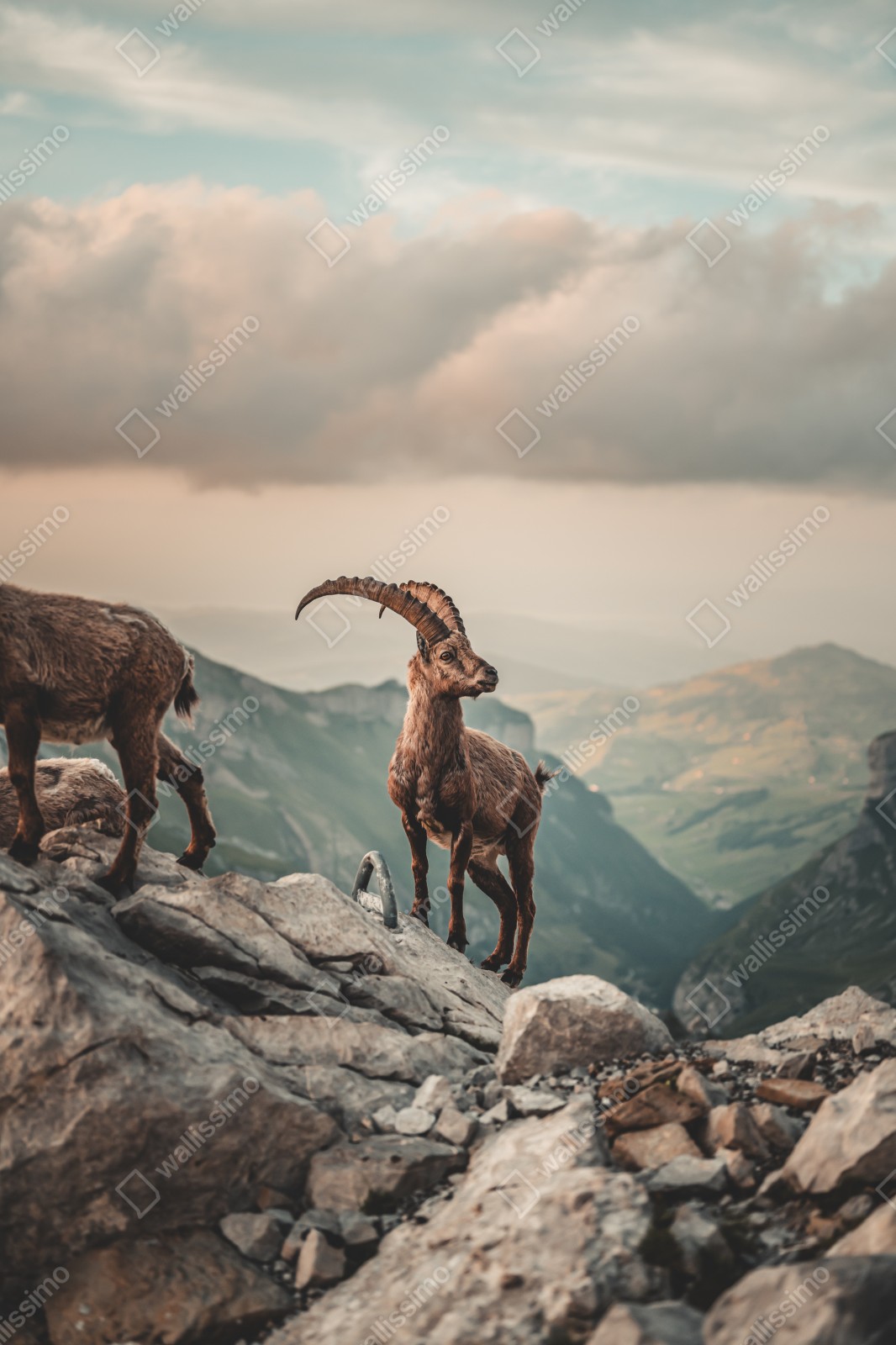 Bringen Sie wilde Alpenstimmung in Ihr Zuhause mit diesem ruhigen Foto eines Steinbocks auf einem felsigen Grat, das Abenteuer und Gelassenheit ausstrahlt.