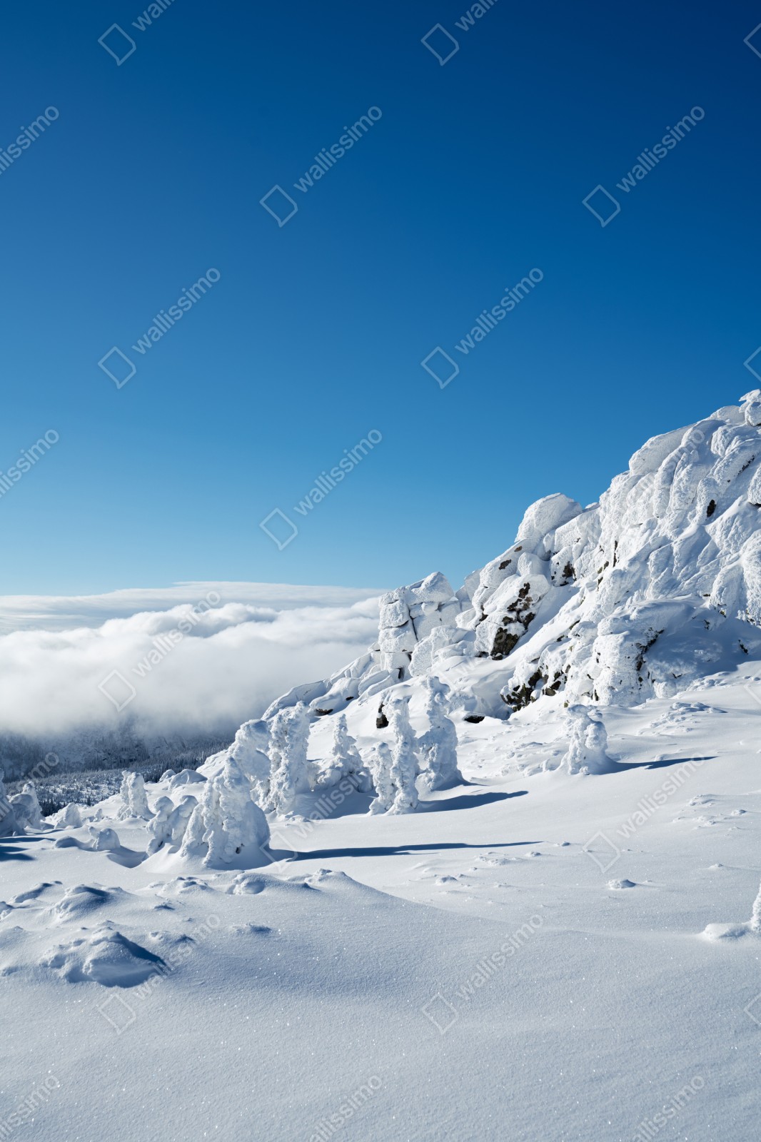 Erleben Sie die klare Stille eines Hochgebirgswinters mit reinem Schnee und tiefblauem Himmel, die jedem Raum eine ruhige, luftige Atmosphäre verleiht.