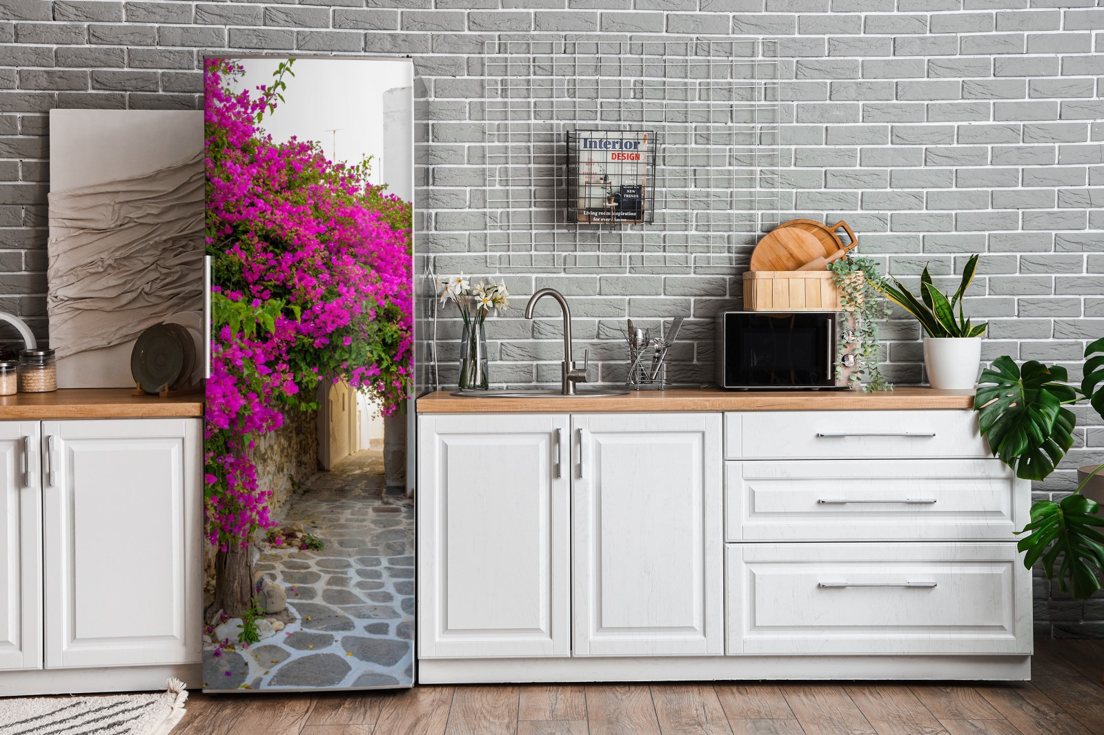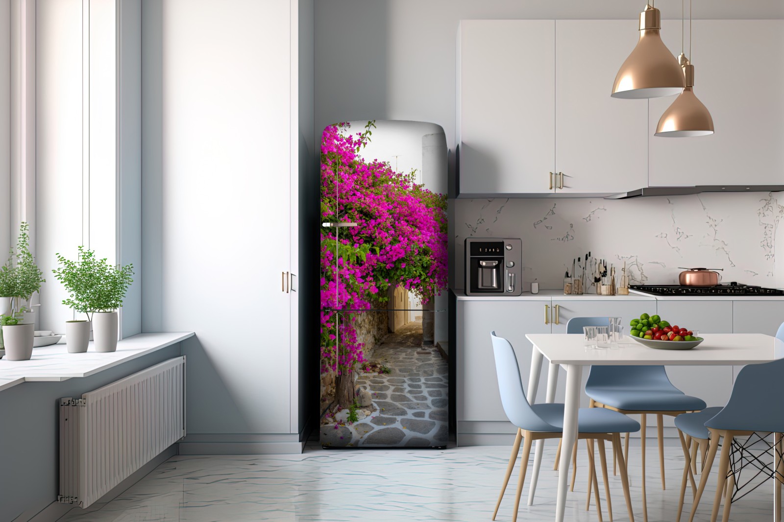 Kühlschrankaufkleber blühende bougainvillea in Naousa gasse
