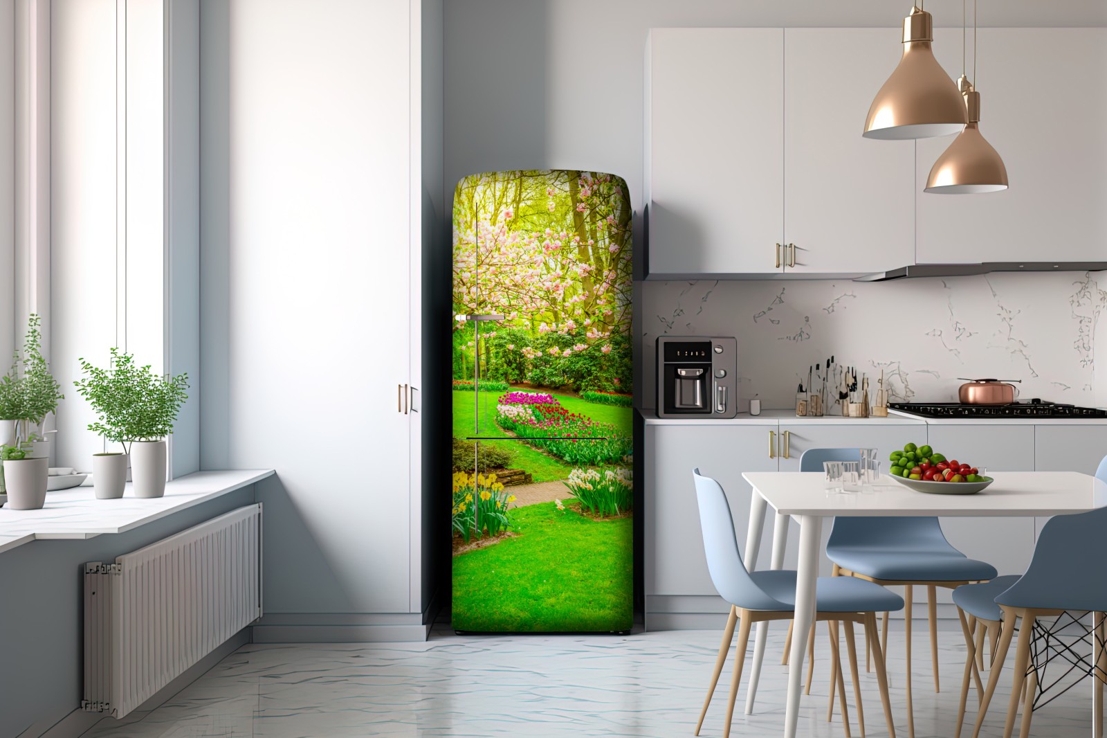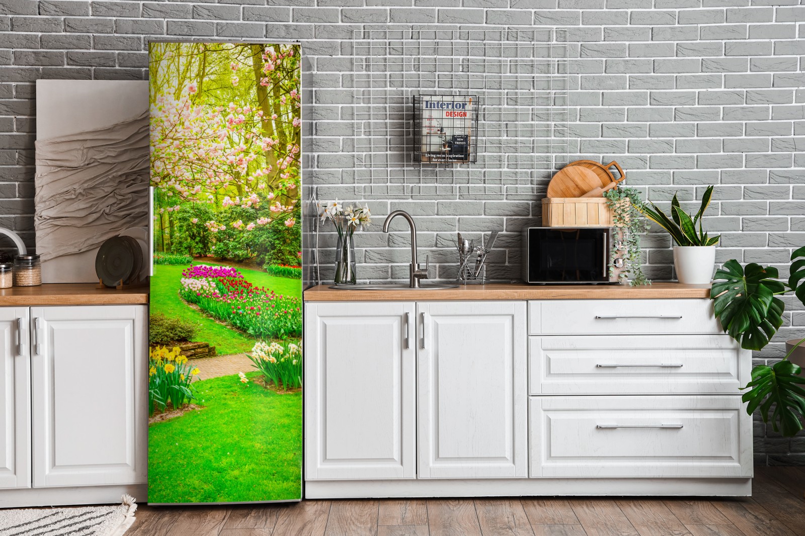 Kühlschrankaufkleber frühlingsgarten in blüte: tulpen und kirschblüten