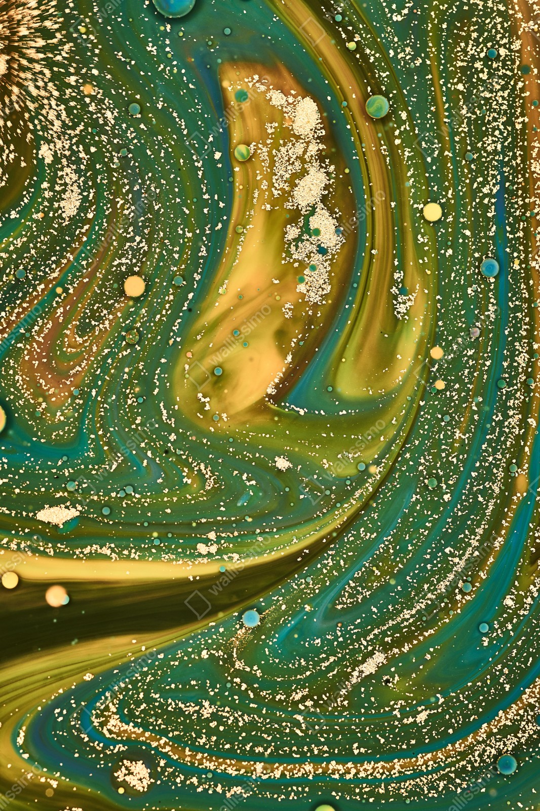 Verleihen Sie Ihren Wänden Dynamik mit einer grün-goldenen, flüssig marmorierten Kunst mit schimmernden Details.
