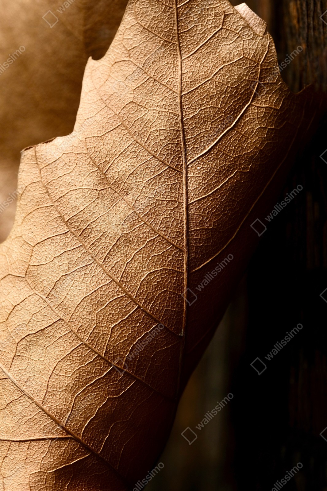 Bringen Sie natürliche Textur und Wärme in Ihren Raum mit dieser detaillierten Nahaufnahme eines getrockneten Blattes. Perfekt für Wohnzimmer oder Büro.