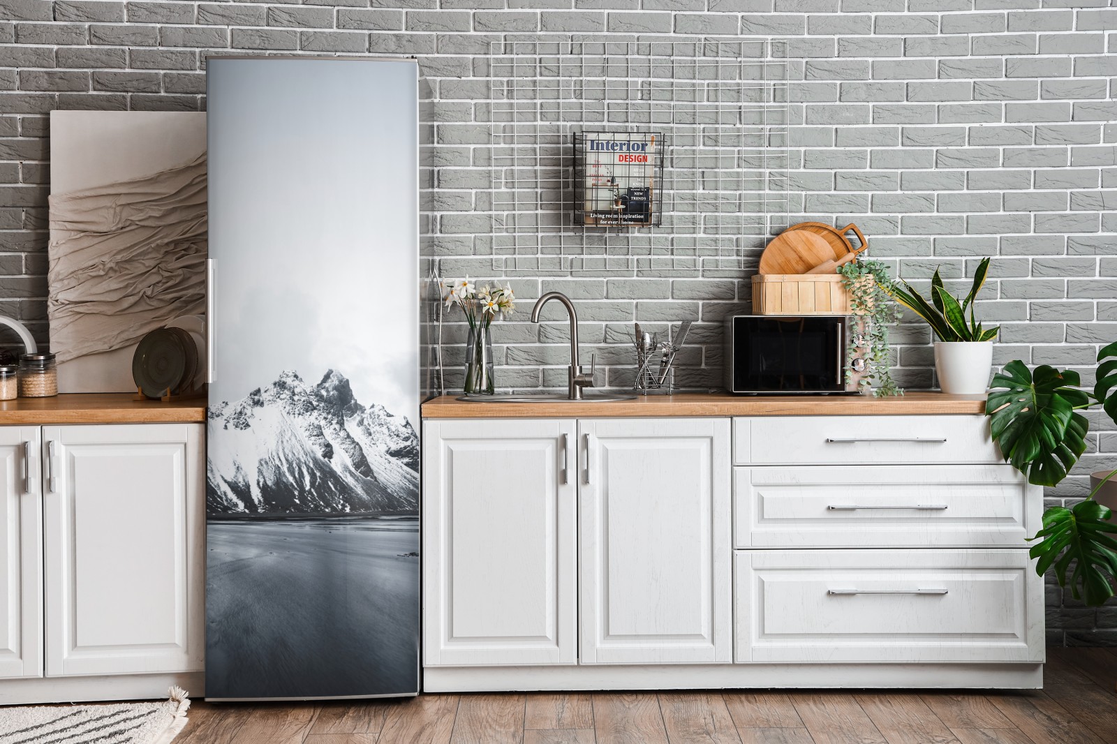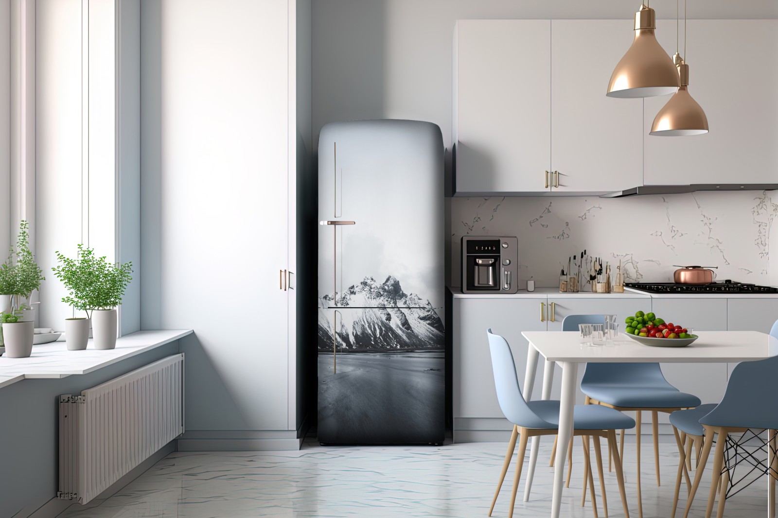 Kühlschrankaufkleber ruhige schneebedeckte berglandschaft am meer