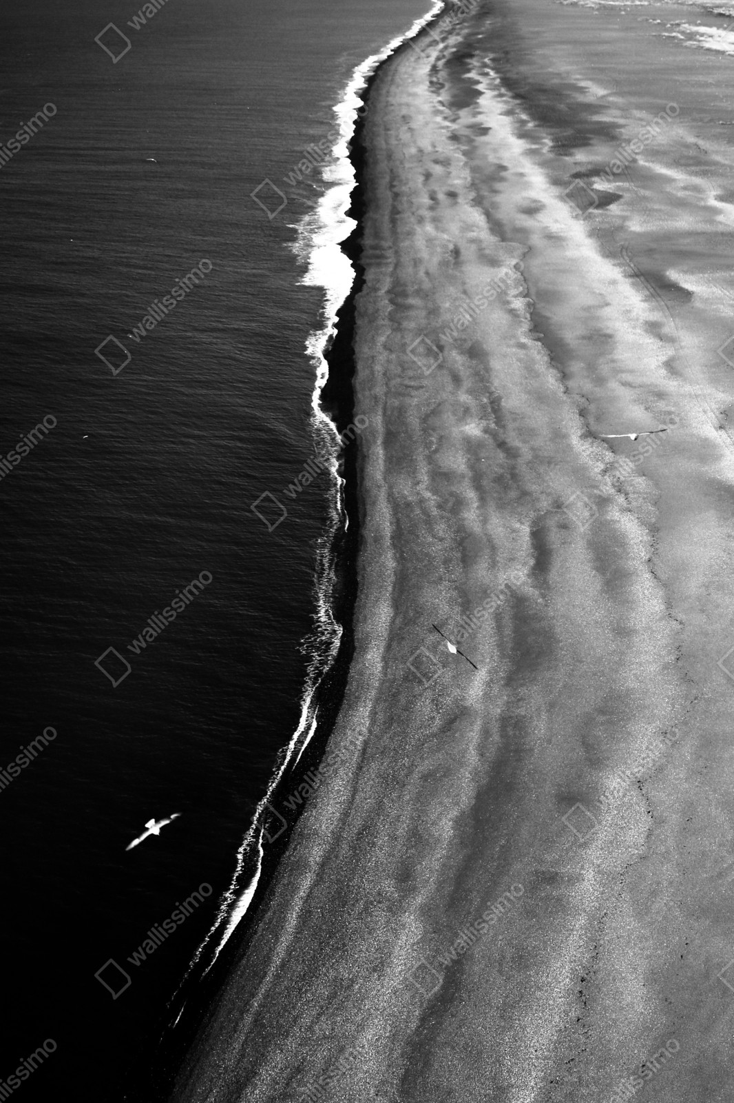 Verleihen Sie Ihrem Raum eine ruhige, moderne Note mit dieser minimalistischen, monochromen Luftaufnahme der Küste und fliegenden Möwen.