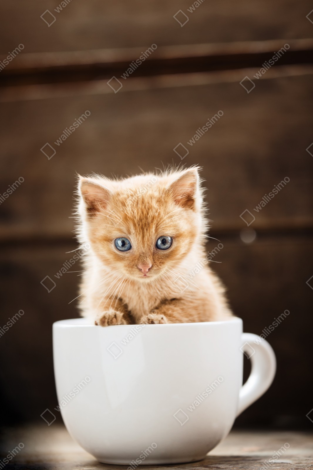 Niedliches rötliches Kätzchen blickt aus einer weißen Teetasse und verleiht jedem Raum Wärme und Charme.
