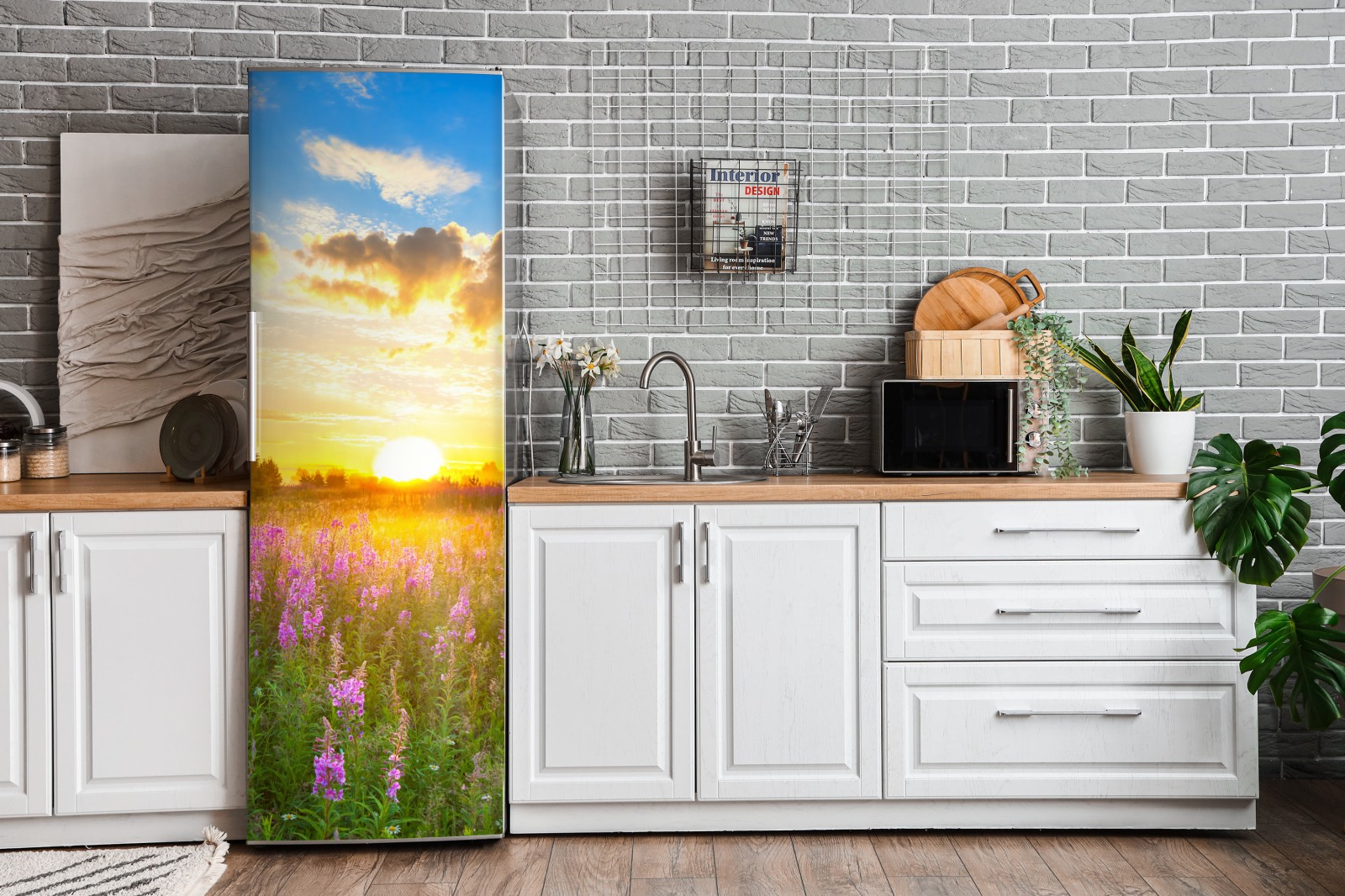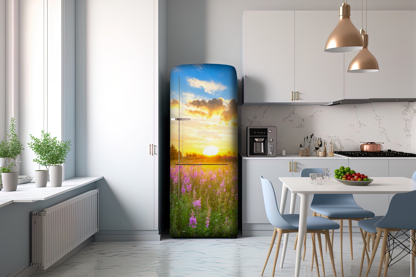 Kühlschrankaufkleber sonnenaufgang über violetter wildblumenwiese