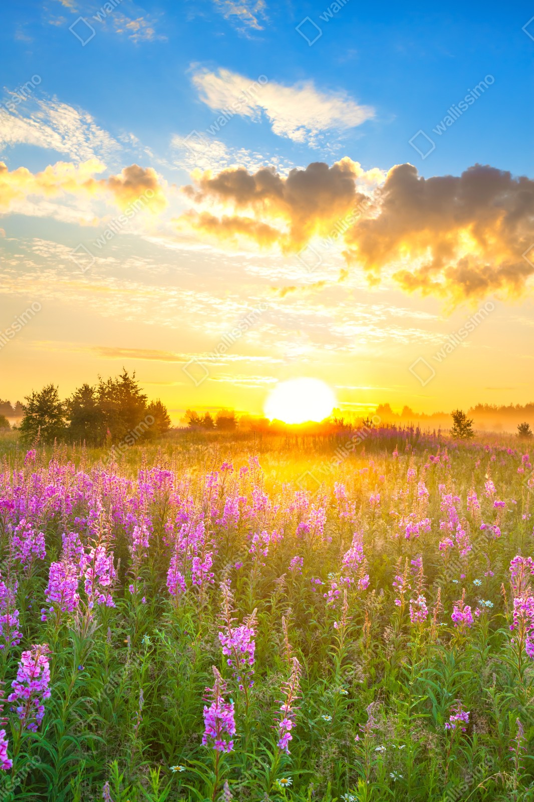 Bringen Sie die Ruhe einer violetten Wildblumenwiese in Ihr Zuhause mit diesem lebendigen Sonnenaufgangsbild.