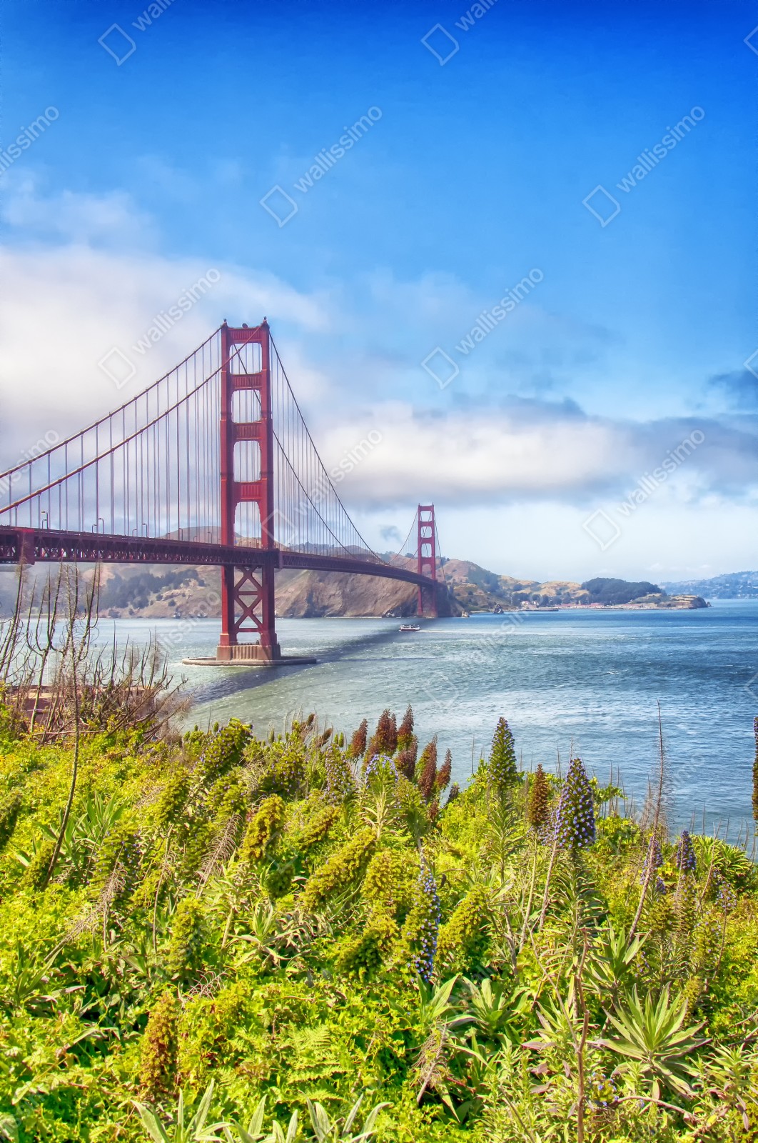 Bringen Sie ikonische Ausblicke auf San Francisco in Ihr Zuhause mit diesem lebendigen Motiv des Golden Gate und der Marin Hills unter klarem blauem Himmel.