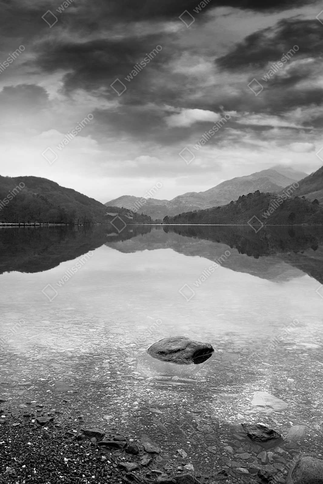 Bringen Sie zurückhaltende Eleganz in Ihr Zuhause mit diesem schwarz-weißen Foto eines Bergsees mit perfekter Spiegelung.