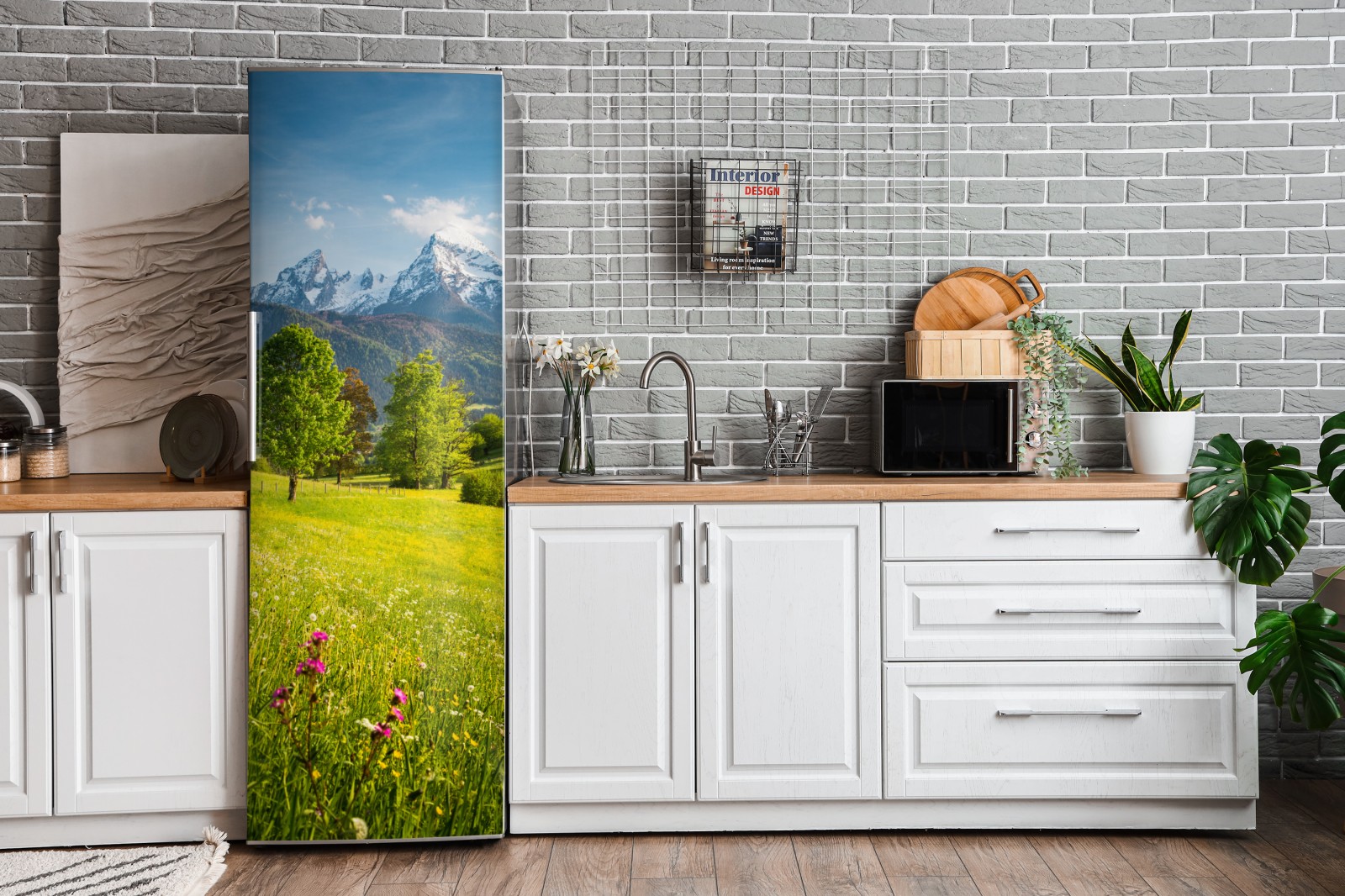 Kühlschrankaufkleber alpine frühlingswiese unter schneebedeckten gipfeln