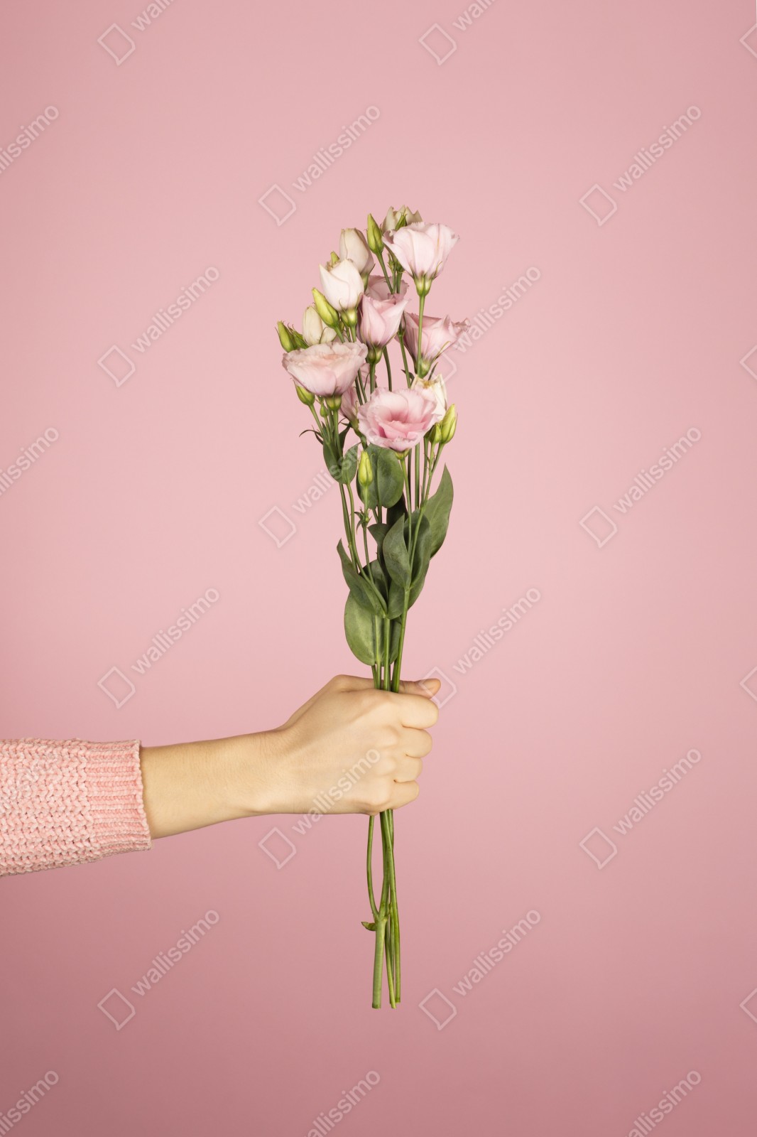 Bringen Sie sanfte Eleganz in Ihr Zuhause mit einem zarten rosa Eustoma-Strauß vor pastellfarbenem Hintergrund, perfekt für minimalistische Räume.