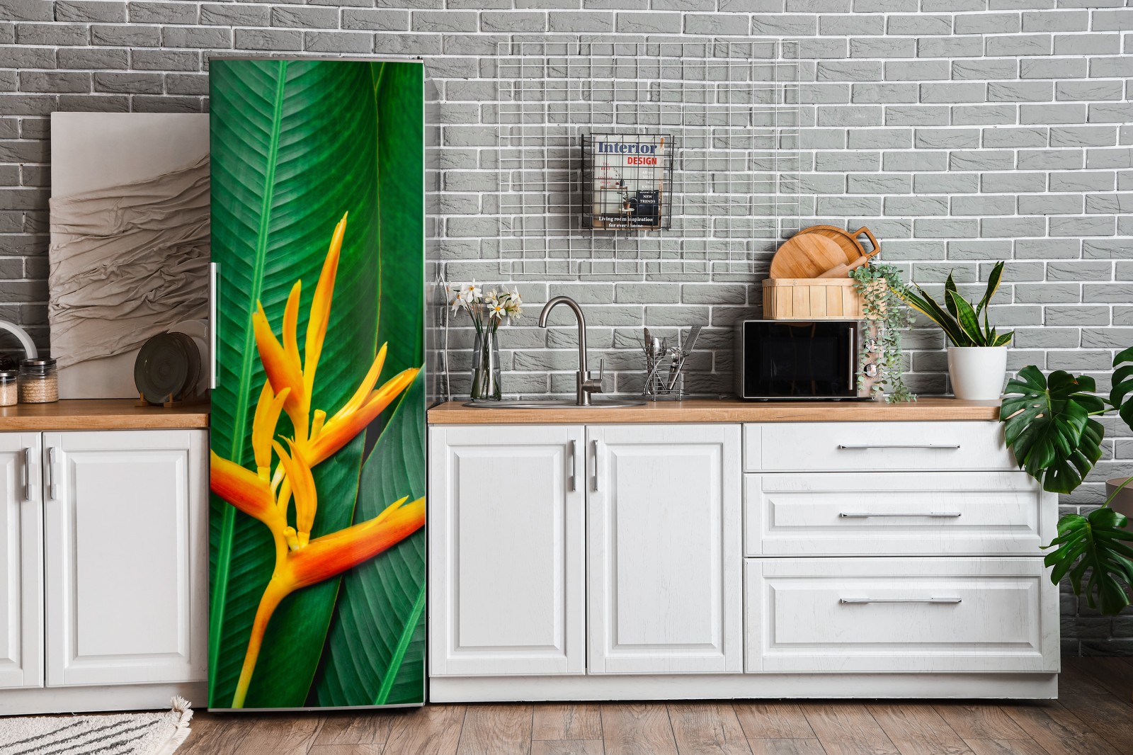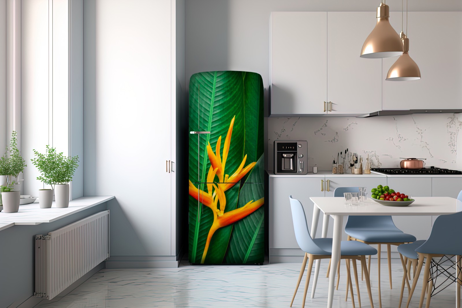 Kühlschrankaufkleber leuchtende heliconia vor grünen blättern