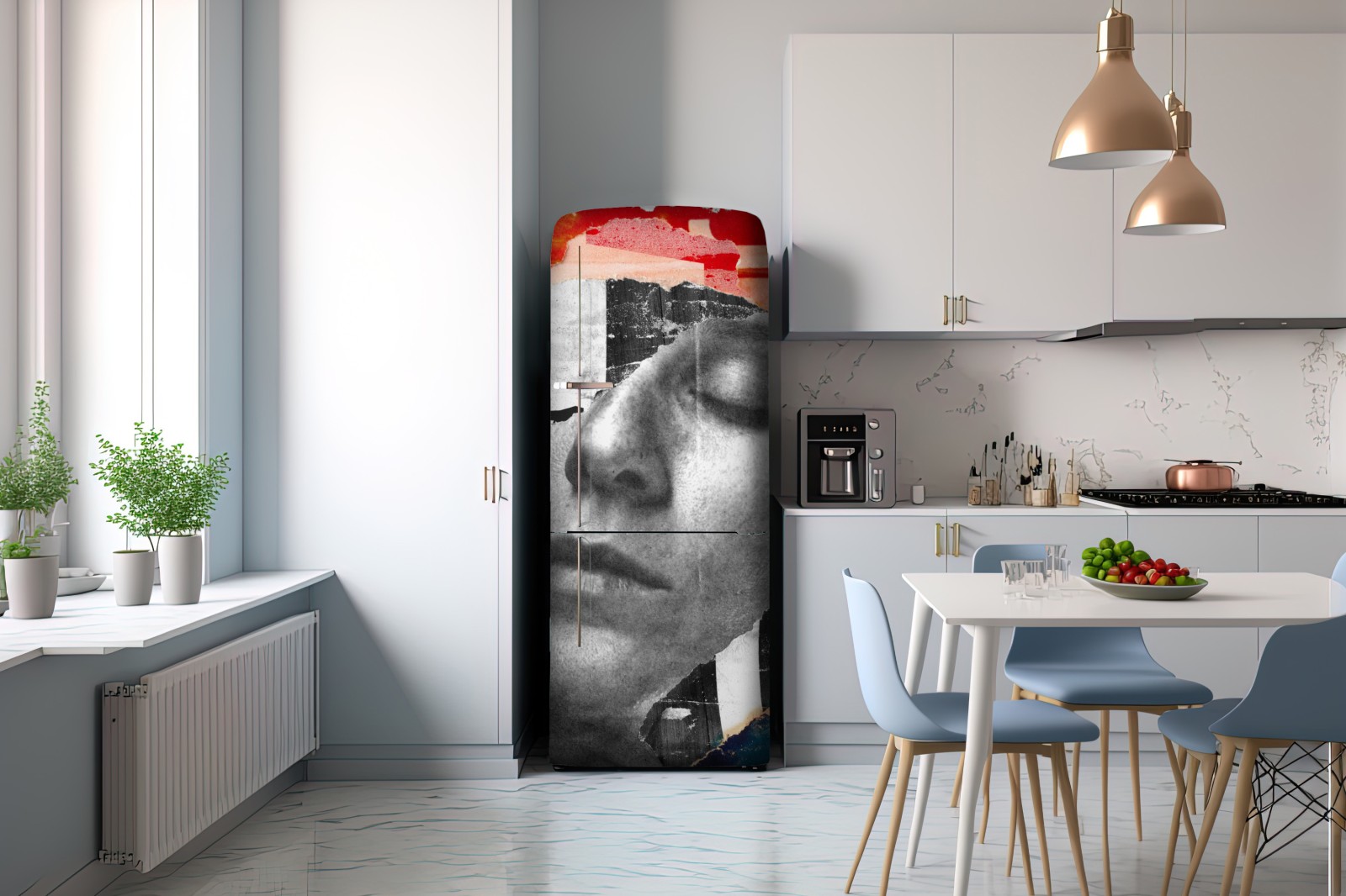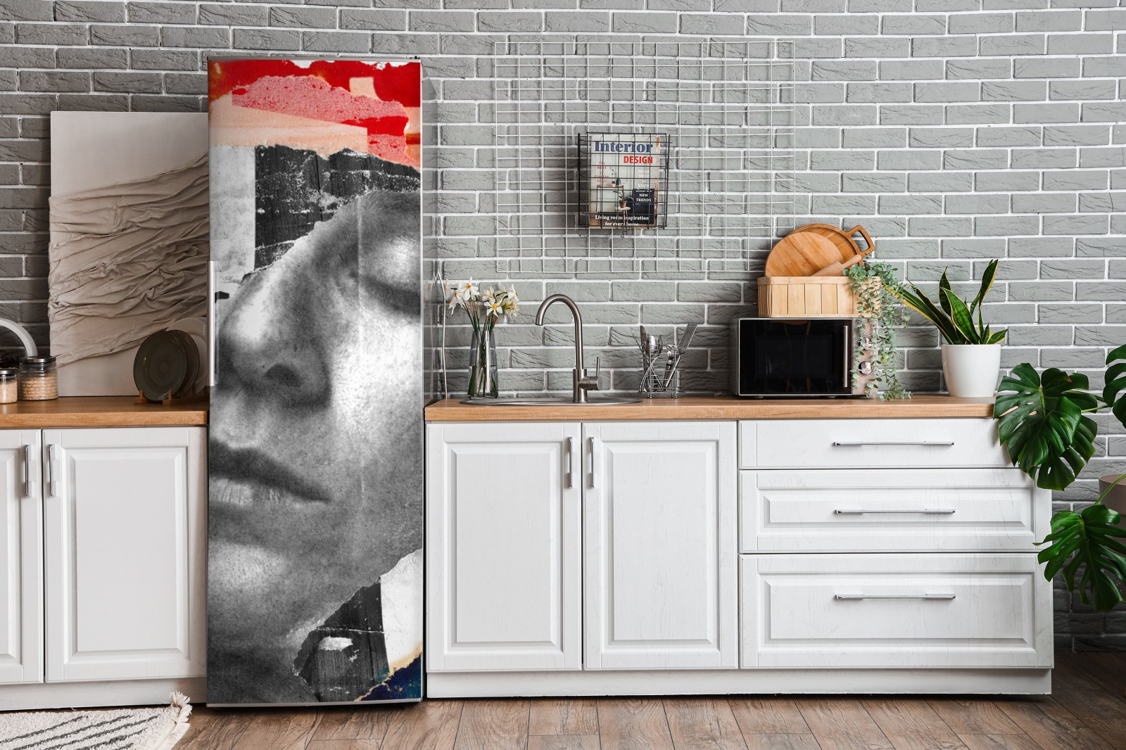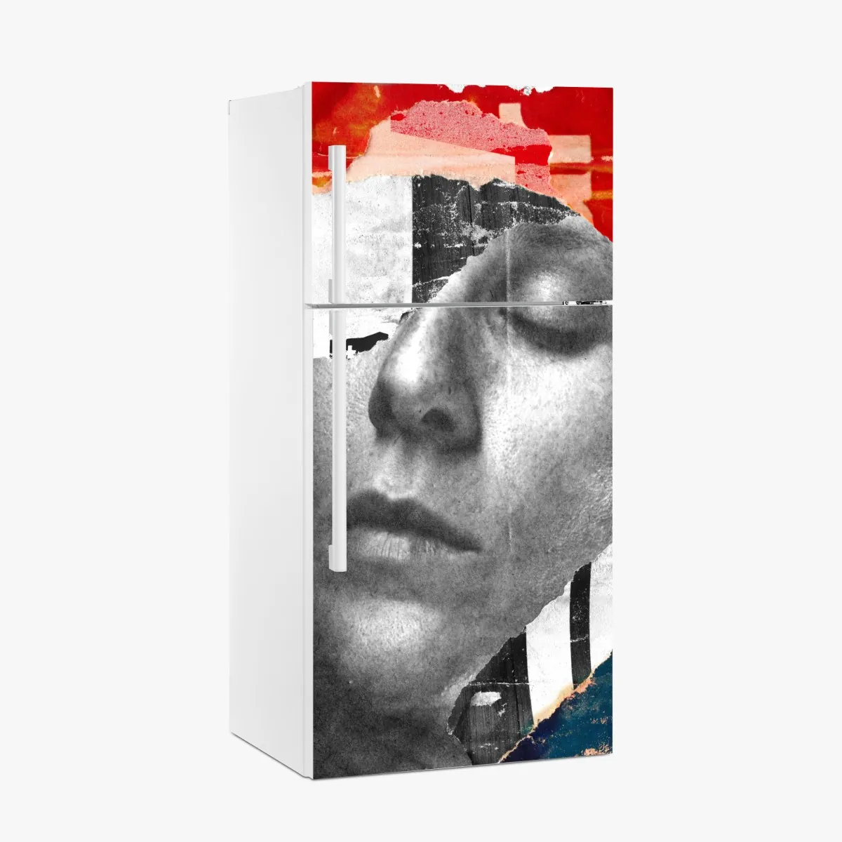 Entdecken Sie eine eindrucksvolle zerrissene Porträt-Collage, die monochrome Porträtfotografie mit kräftigen Farbflächen verbindet und einen urbanen, emotionalen Blickfang schafft.