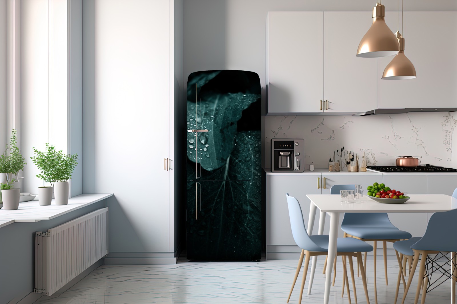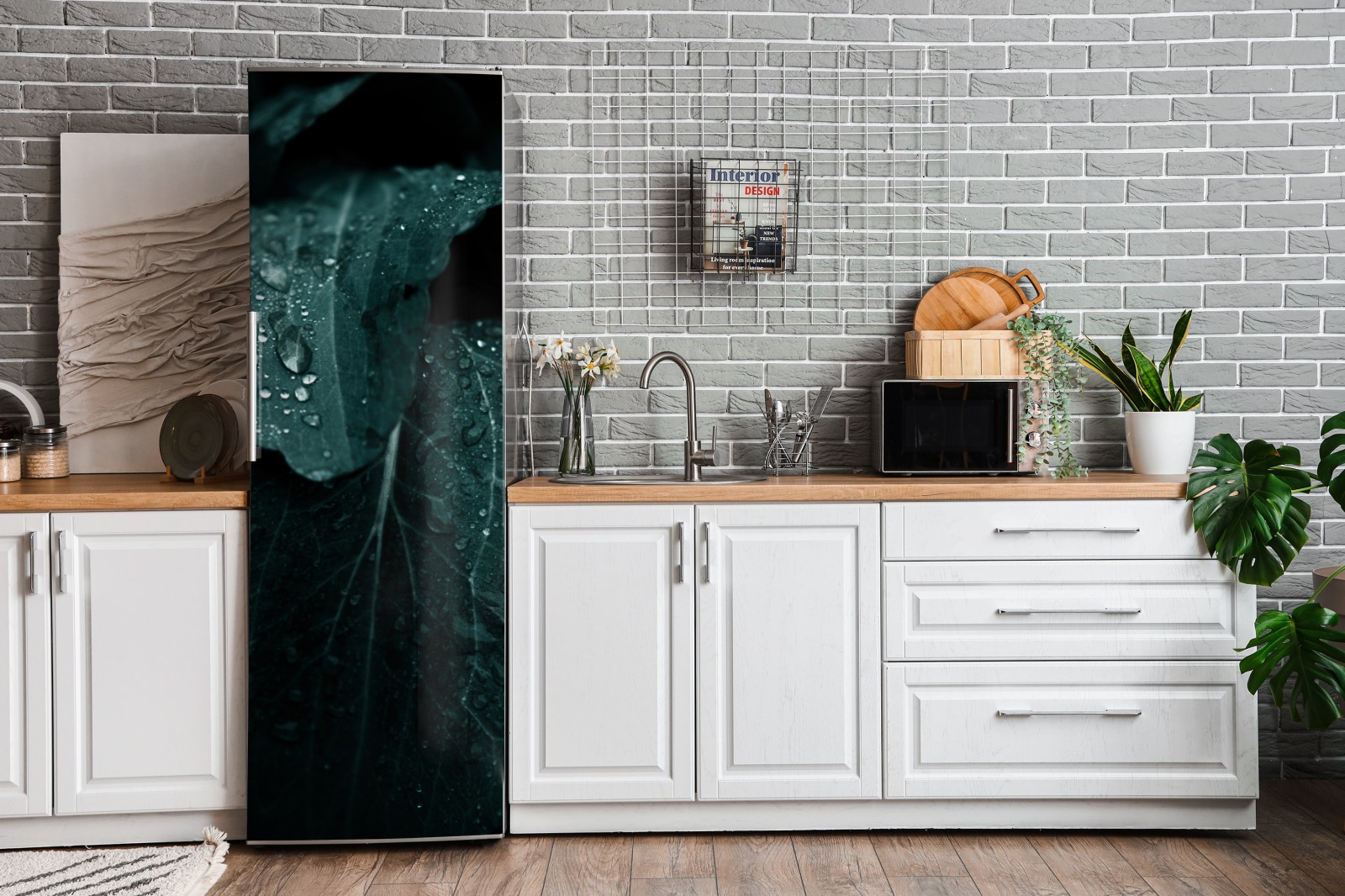 Bringen Sie Ruhe und natürliche Textur in Ihr Zuhause mit dieser Nahaufnahme von Tautropfen auf Blättern in beruhigenden türkisfarbenen Tönen.