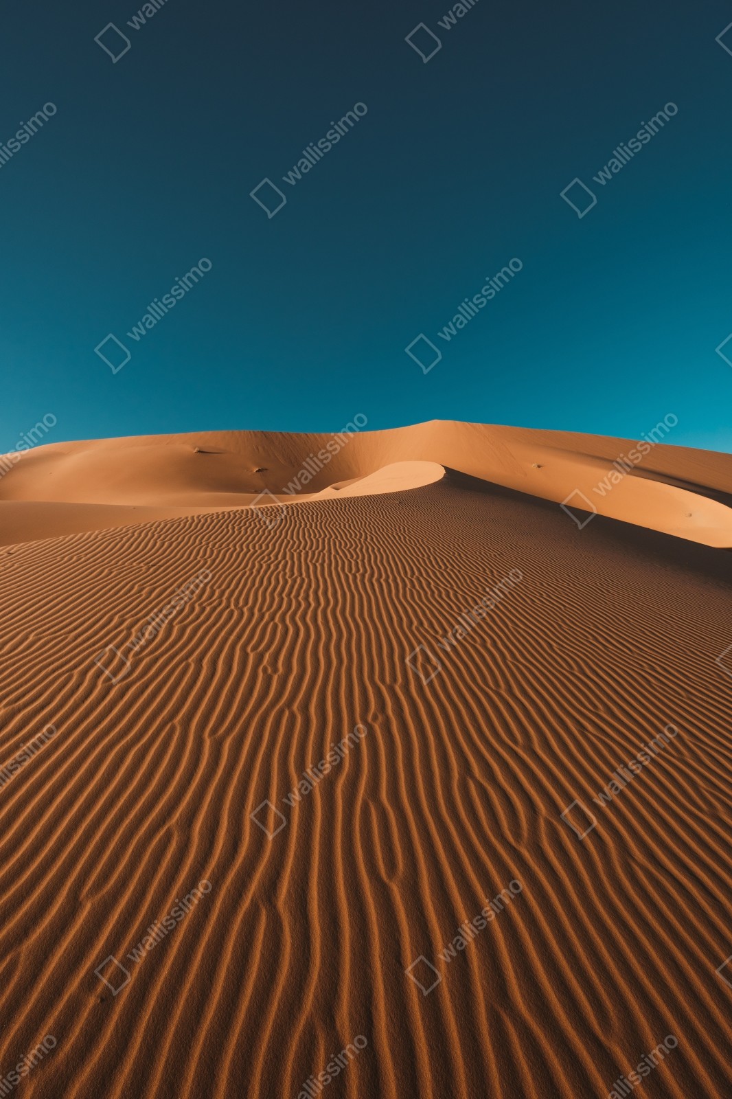 Bringen Sie ruhige Wüstenästhetik in Ihr Zuhause mit diesem Bild von windgeformten Sanddünen vor einem intensiven blauen Himmel.
