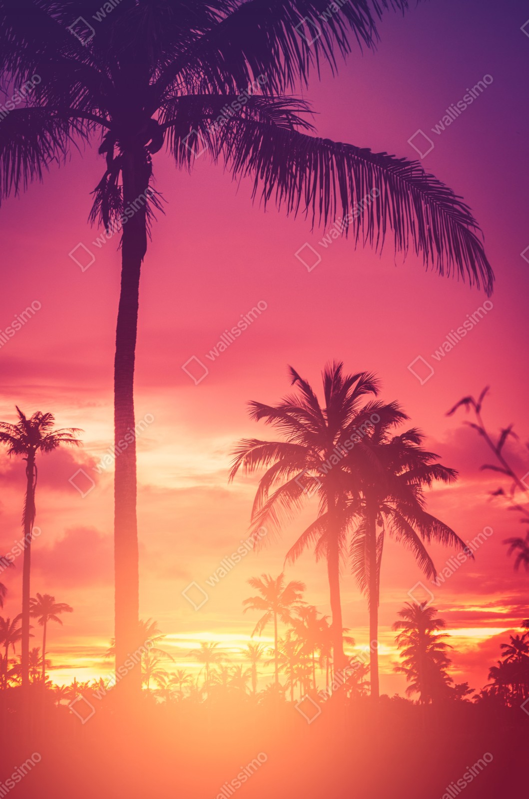Erleben Sie einen warmen tropischen Sonnenuntergang mit dramatischen Palmensilhouetten und lebhaften rosa-orangefarbenen Himmeln, der eine entspannte Urlaubsstimmung in Ihr Zuhause bringt.
