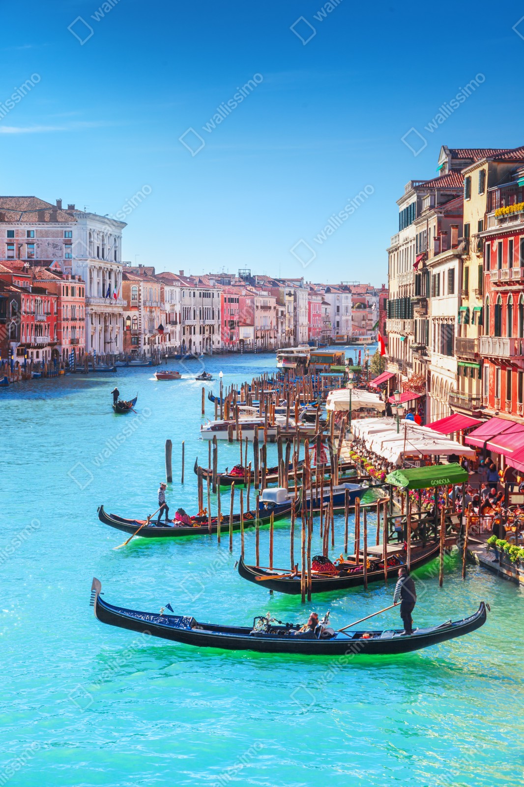 Bringen Sie die lebhaften Kanäle von Venedig in Ihr Zuhause mit dieser sonnigen Stadtansicht, die Gondeln, bunte Gebäude und türkisfarbenes Wasser zeigt.
