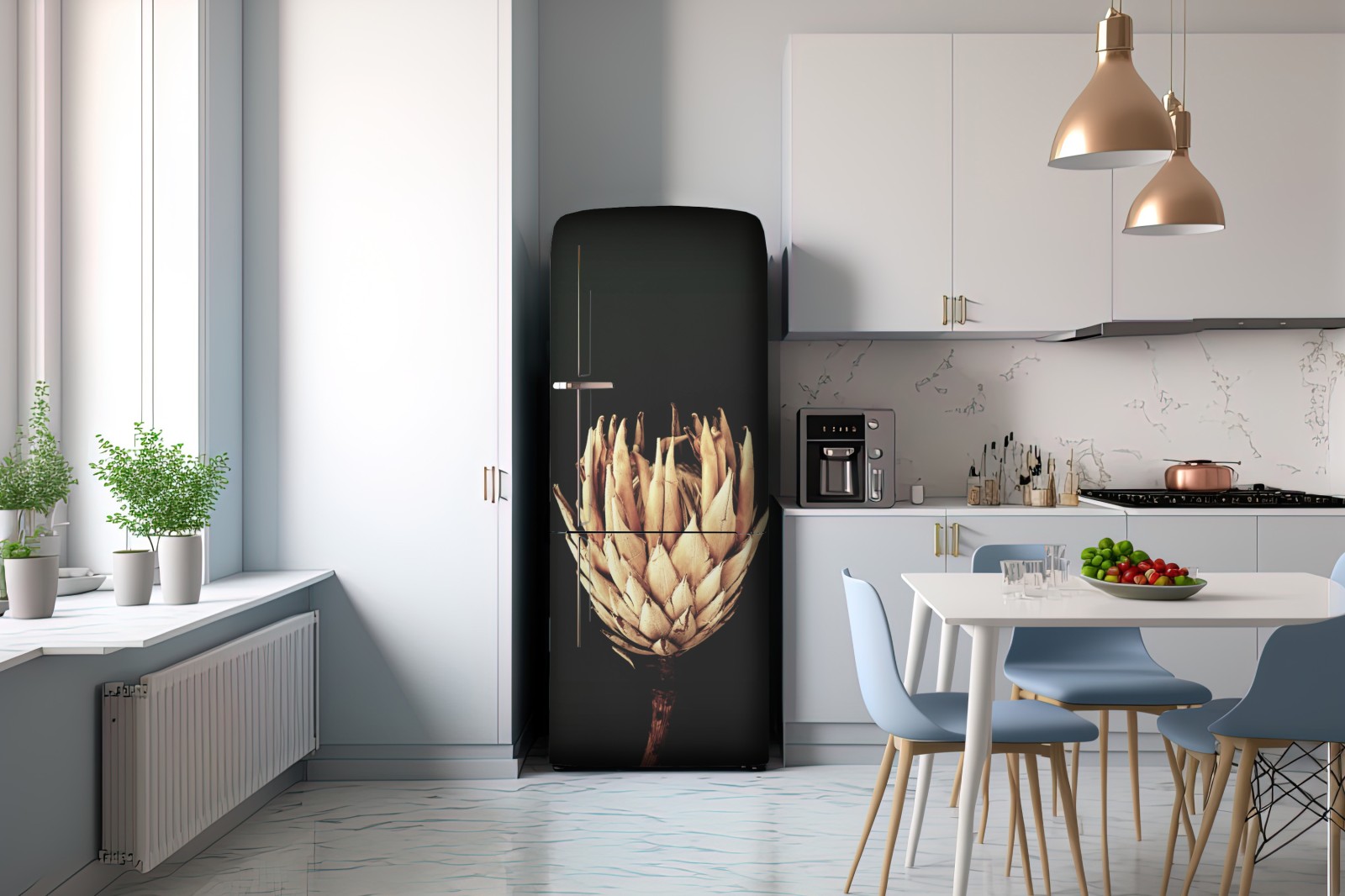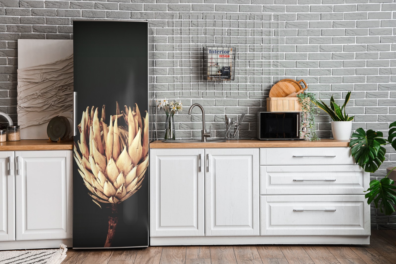 Zeitloses, sepiafarbenes botanisches Motiv einer getrockneten Protea, das natürliche Eleganz und Struktur in jeden Raum bringt.