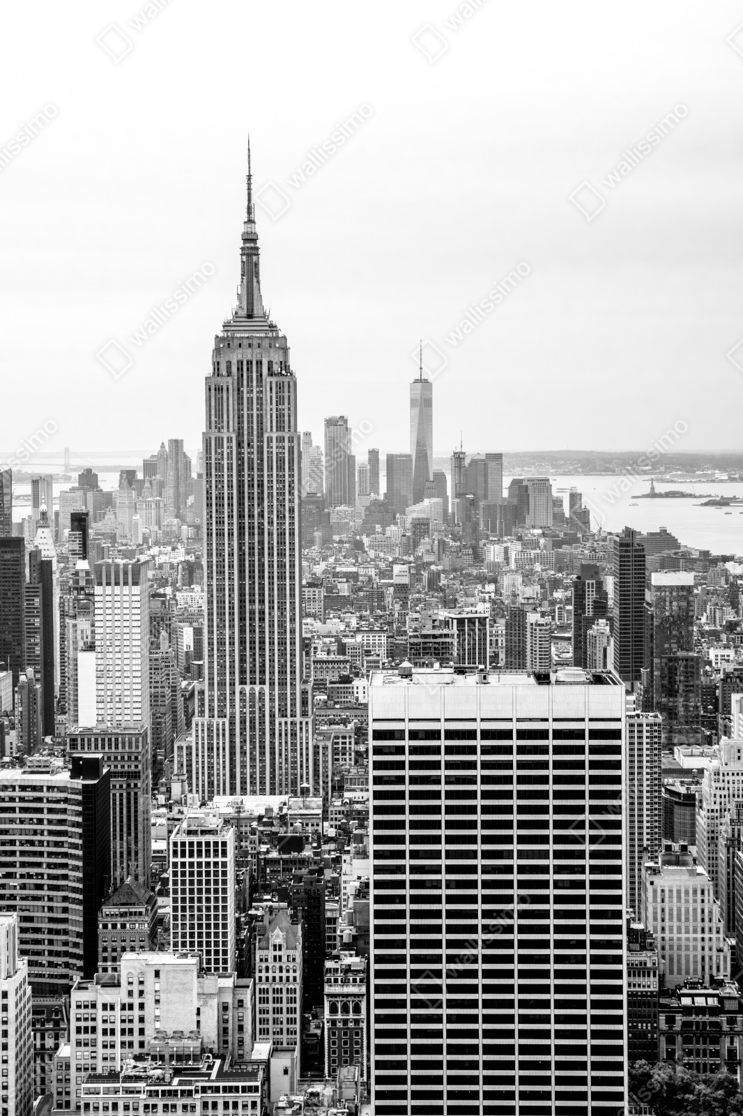 Verleihen Sie Ihren Wänden urbanen Charme mit diesem schwarz-weißen Foto der New Yorker Skyline und dem Empire State Building.