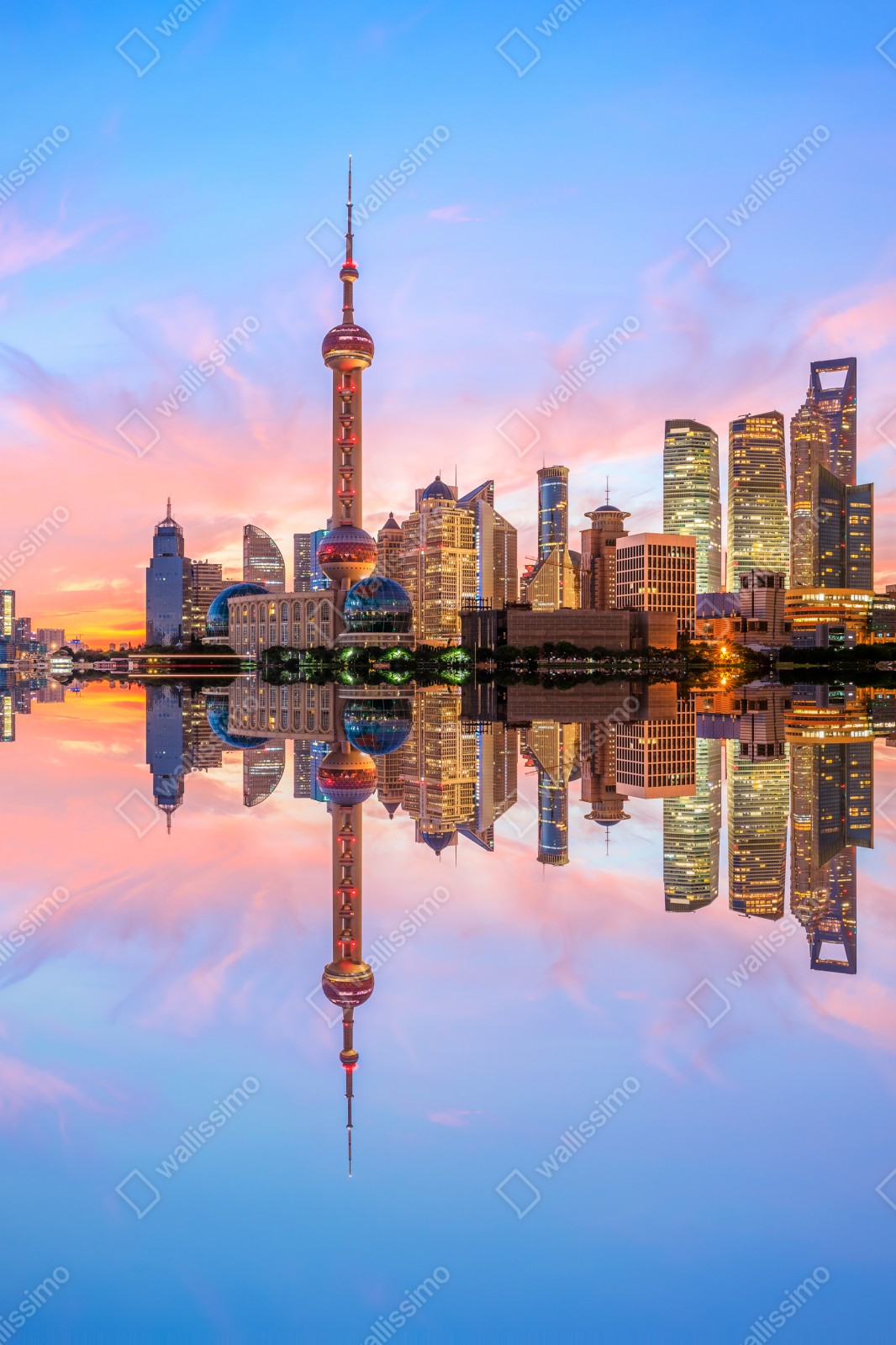 Bringen Sie die sanfte Energie Shanghais in Ihr Zuhause mit dieser pastellfarbenen Stadtszene bei Sonnenaufgang und der spiegelnden Wasserreflexion.
