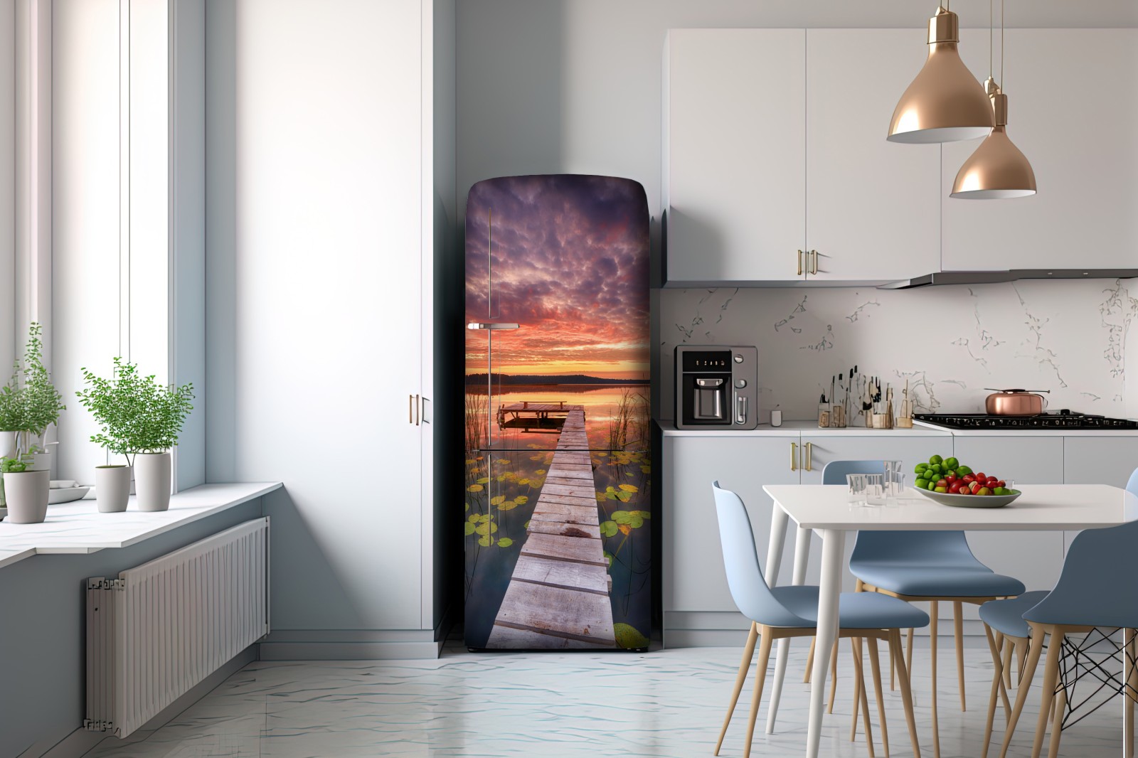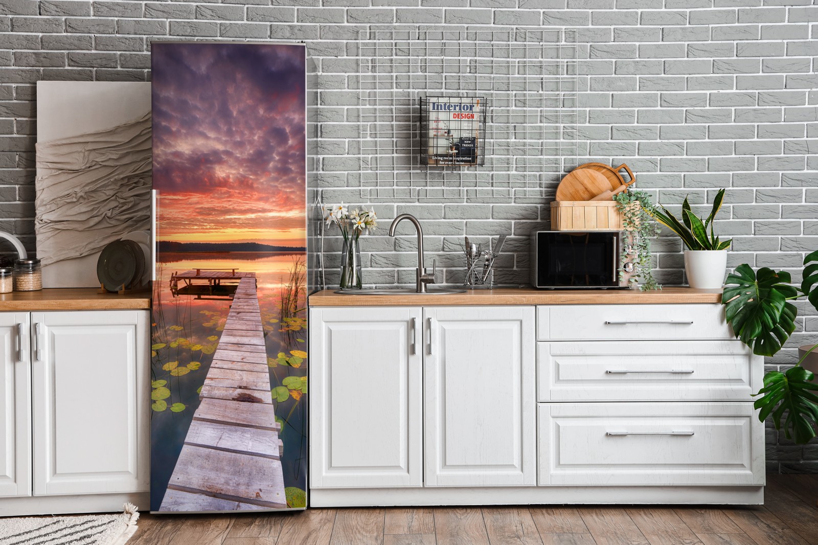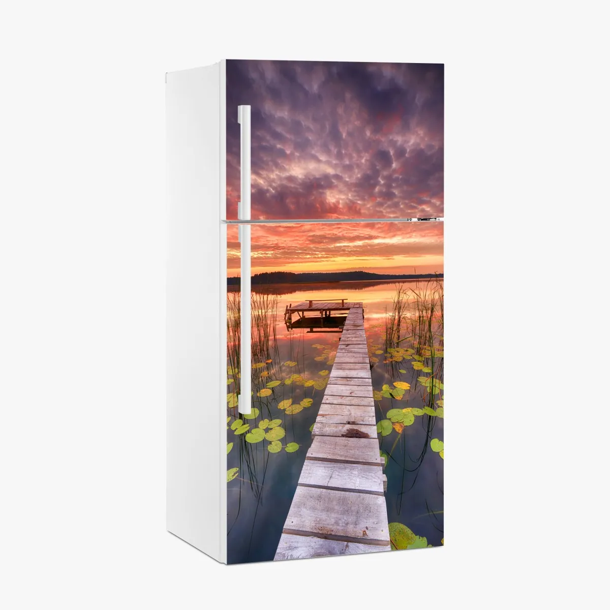 Kühlschrankaufkleber sonnenaufgang über ruhigem see mit steg