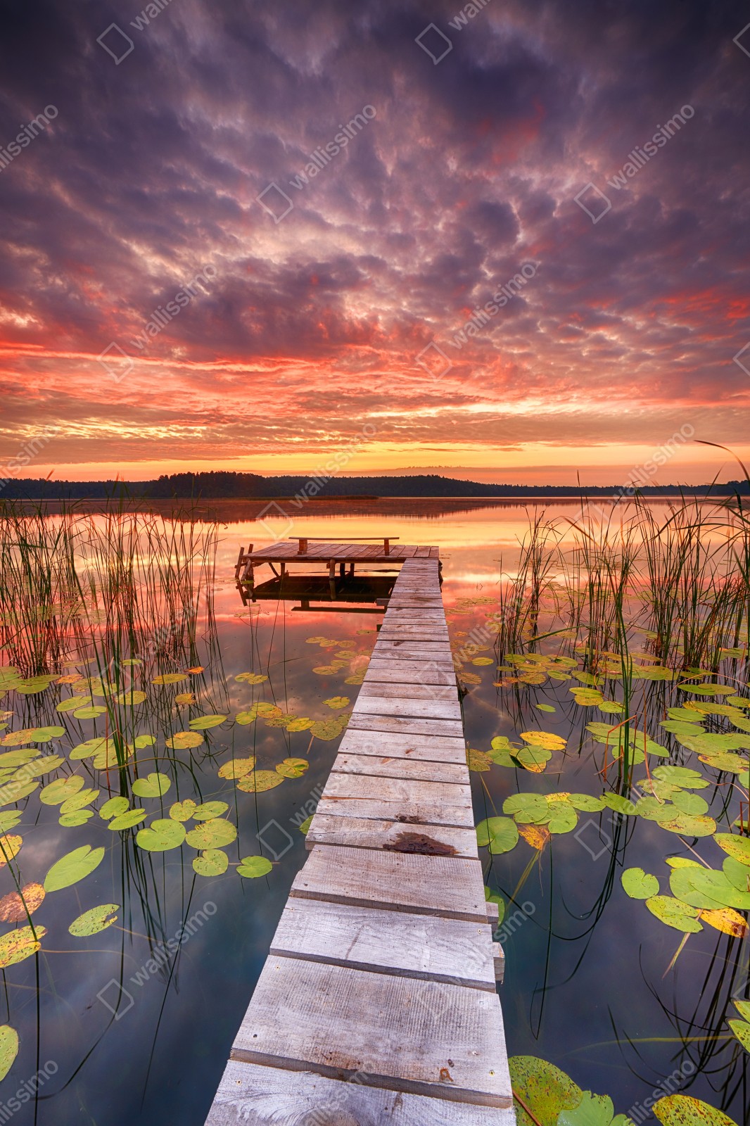 Bringen Sie die Ruhe eines Sommermorgens in Ihr Zuhause mit diesem farbenfrohen Sonnenaufgang über einem stillen See.