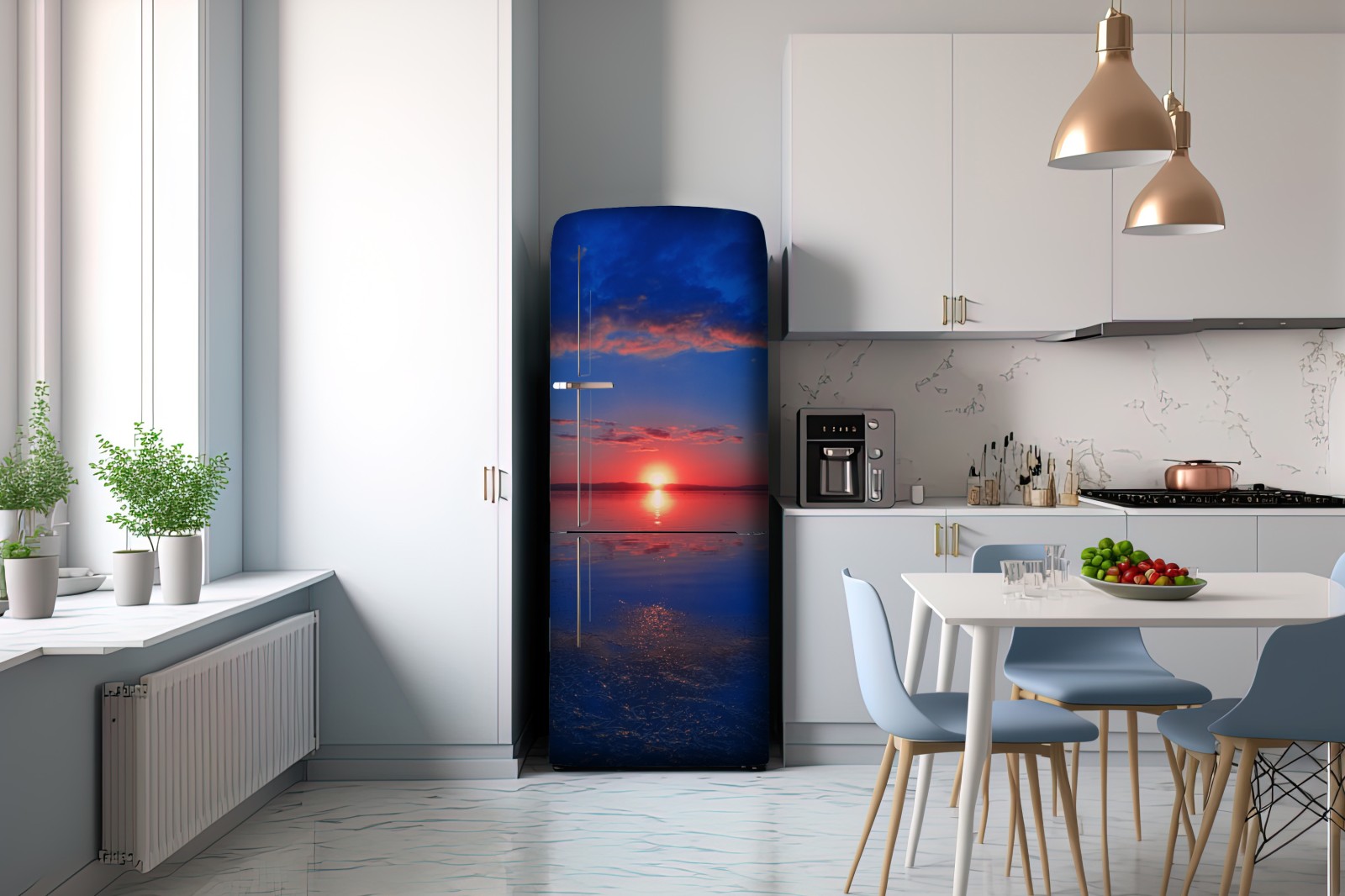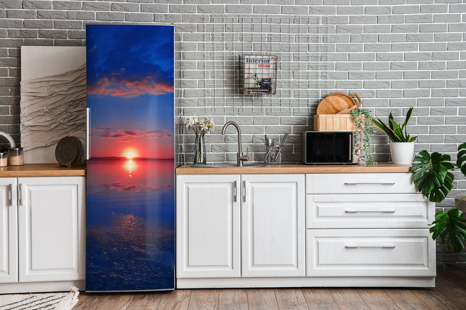Kühlschrankaufkleber sonnenuntergang über ruhigem meer mit lebendiger spiegelung