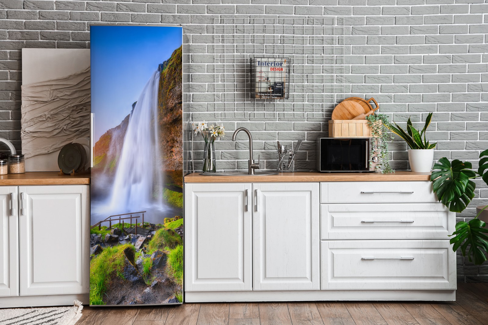 Erleben Sie die ruhige Kraft von Seljalandsfoss, wo kaskadierendes Wasser auf goldene Sonnenuntergangstönen trifft und Ihrem Raum natürliche Dramatik verleiht.