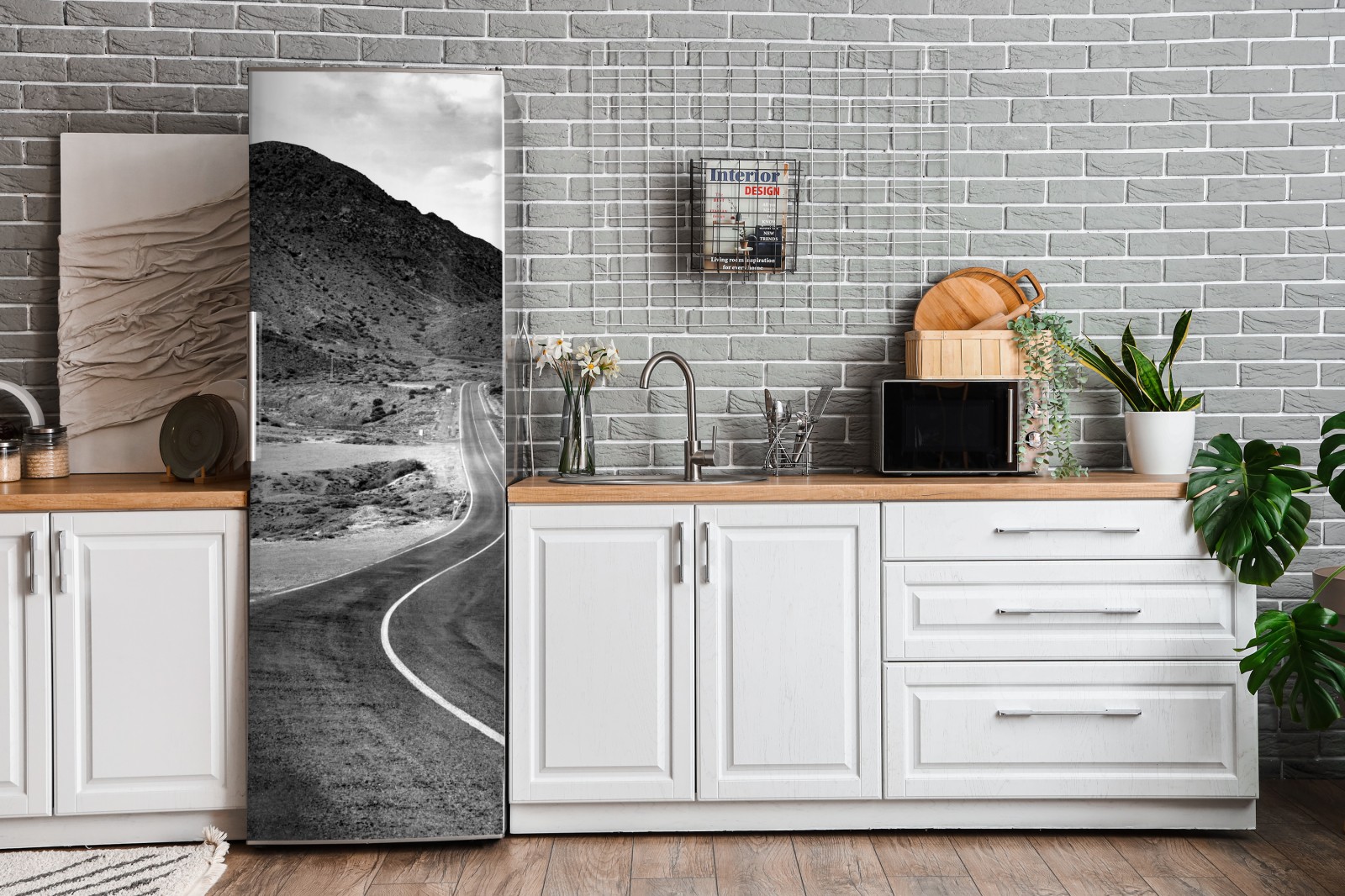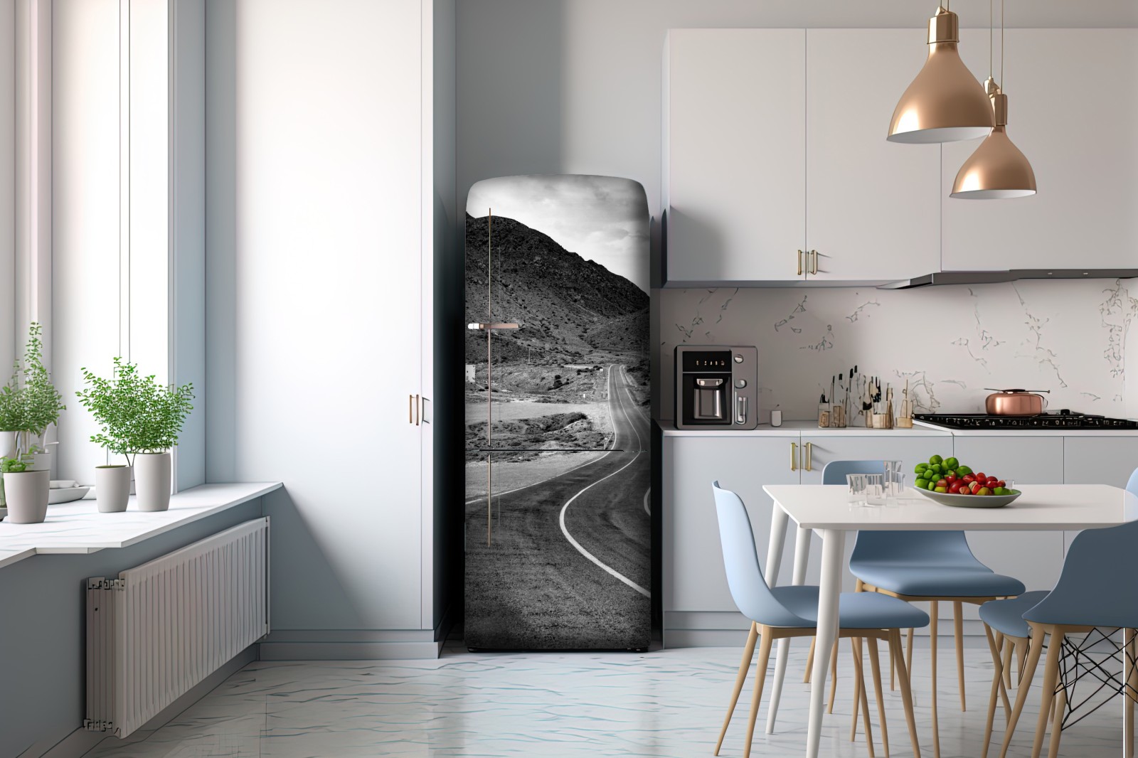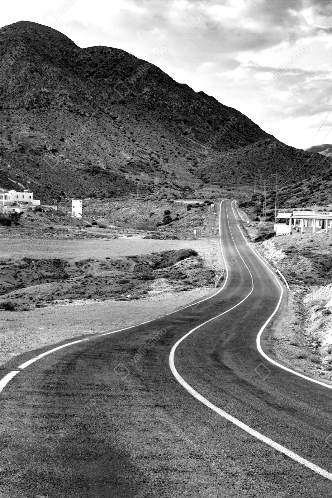 Bringen Sie ruhige monochrome Landschaft in Ihr Zuhause mit diesem eindrucksvollen Foto einer gewundenen Straße, ideal für minimalistische Einrichtungen und Reisefreunde.