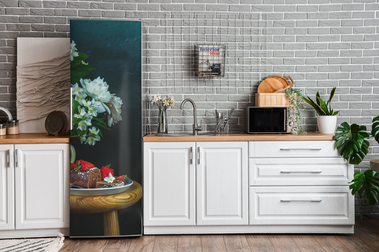Kühlschrankaufkleber schokoladenrolle mit erdbeeren und weißen blüten