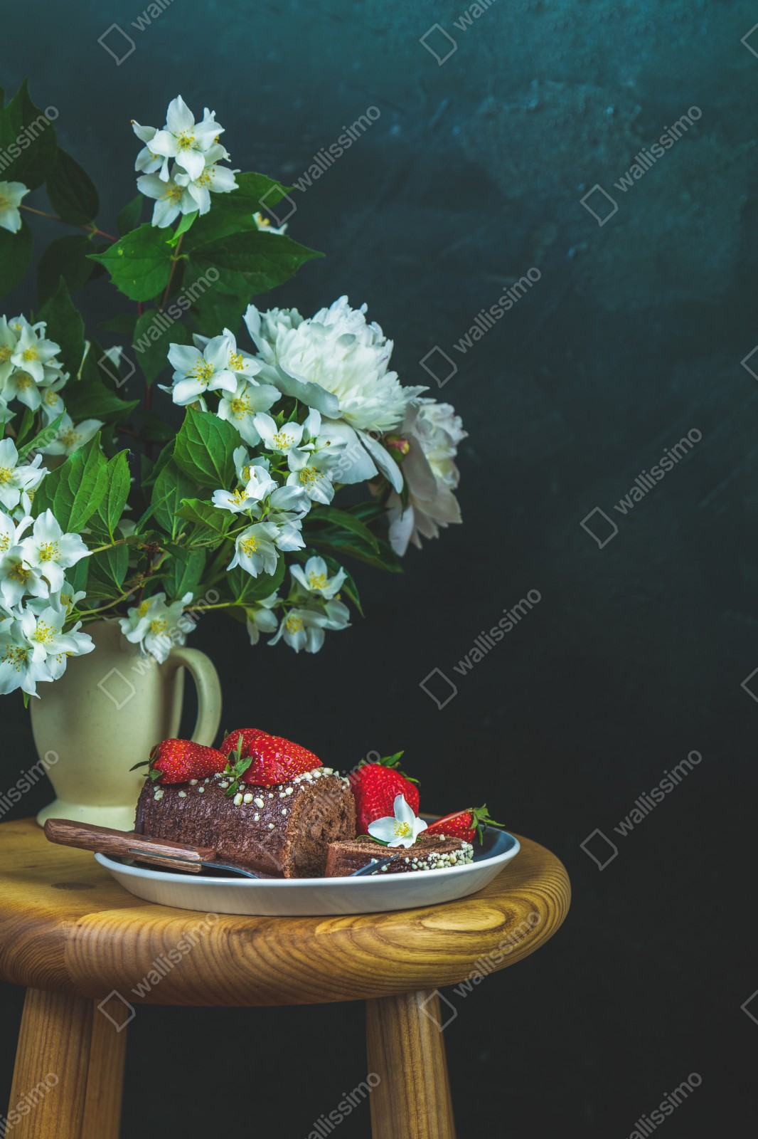 Verleihen Sie Ihrem Raum einen warmen Vintage-Charme mit einer Stillleben-Komposition aus Schokoladenrolle, frischen Erdbeeren und zarten weißen Blüten auf einem Holztisch.