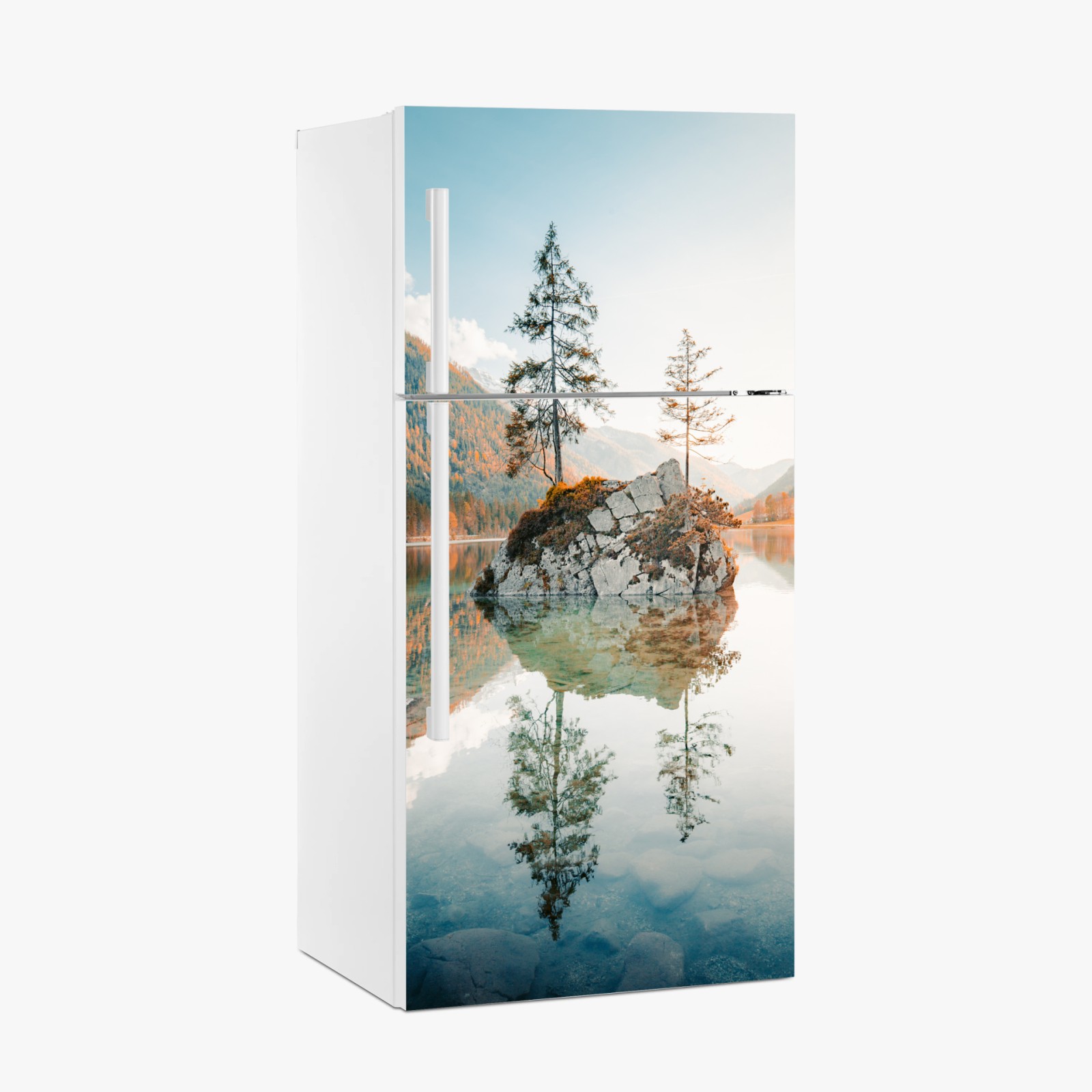 Kühlschrankaufkleber Sonnenbeleuchtete felsinsel am Hintersee