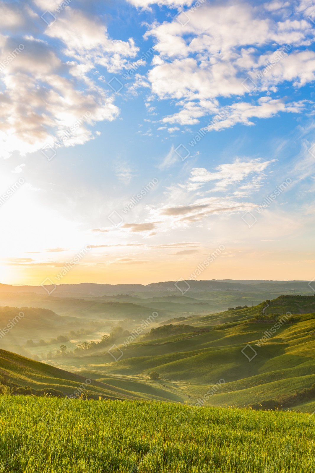 Bringen Sie die ruhige Schönheit eines nebligen Sonnenaufgangs über sanfte Hügel in Ihr Zuhause mit warmen Farben und natürlicher Atmosphäre.