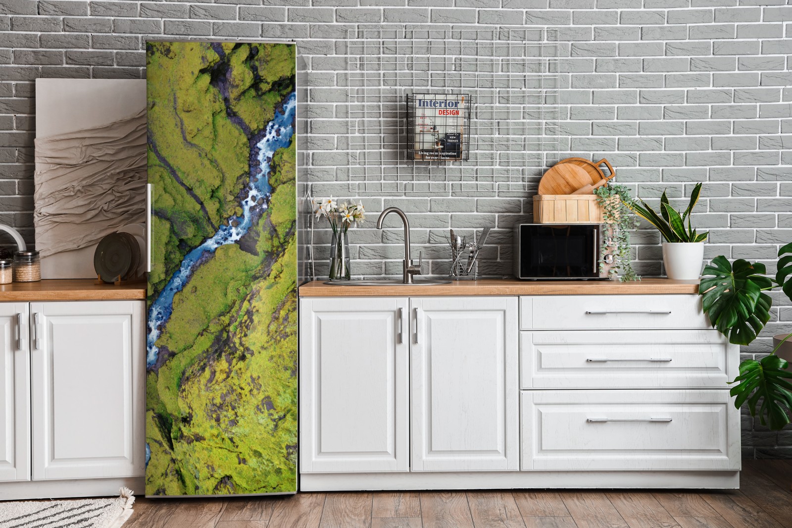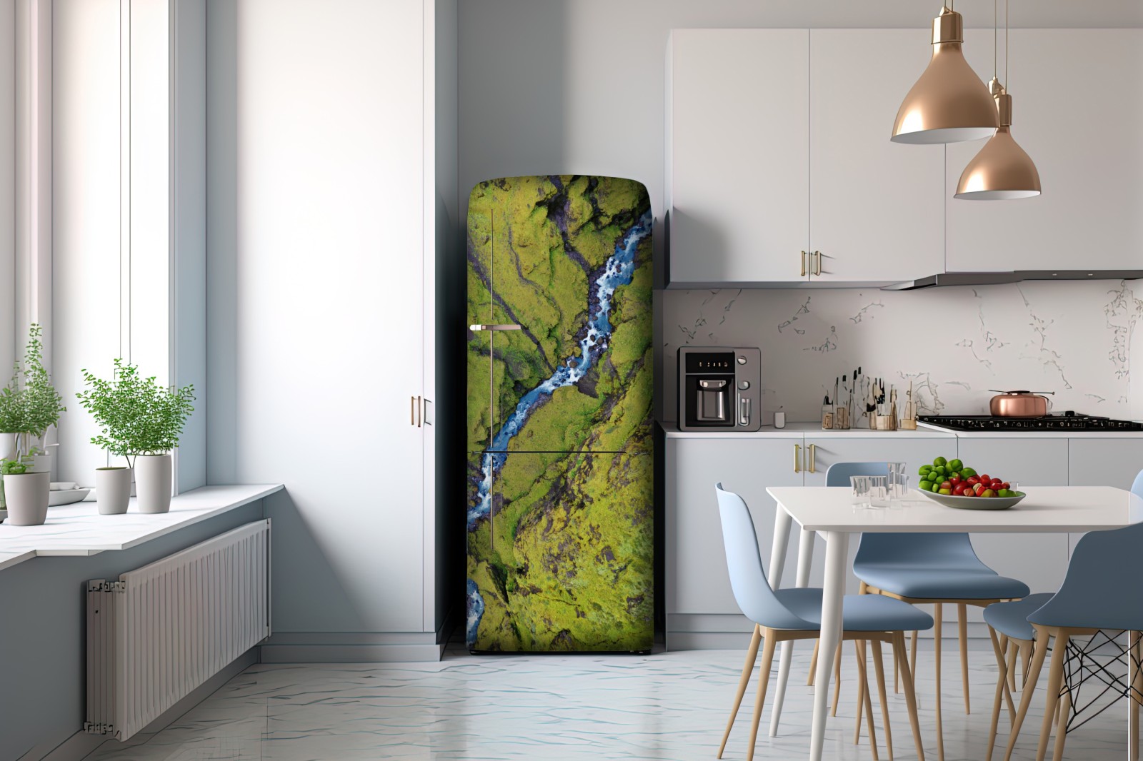 Kühlschrankaufkleber luftaufnahme: fluss in moosbedeckter schlucht
