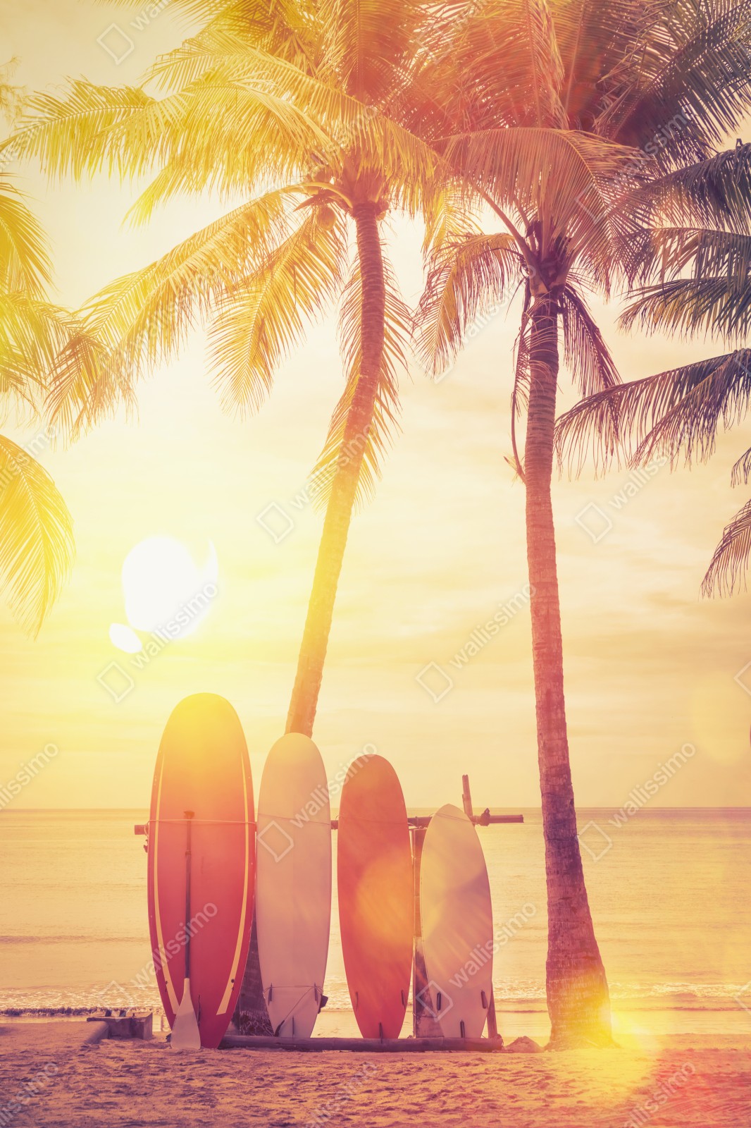 Bringt das entspannte Gefühl eines tropischen Sonnenuntergangs mit Surfboards an einem ruhigen Strand ins Zuhause, eine warme und verträumte Szenerie für jedes Zimmer.