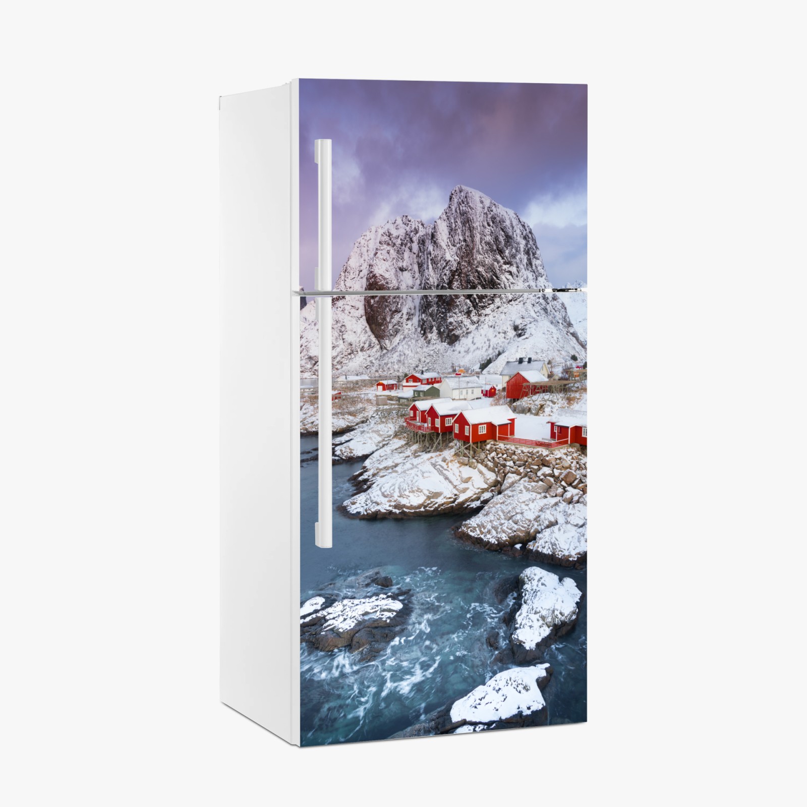 Kühlschrankaufkleber Rote küstenhäuser vor schneebedecktem berg