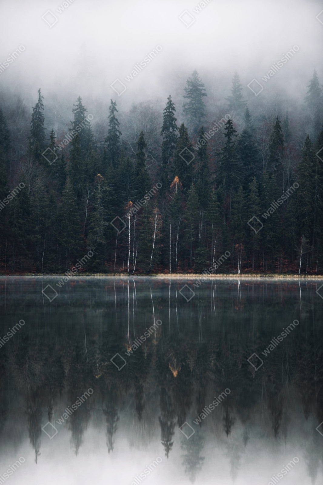 Bringen Sie ruhige Waldatmosphäre in Ihr Zuhause mit diesem Bild einer nebligen Seespiegelung, das natürliche Schönheit und Gelassenheit ausstrahlt.