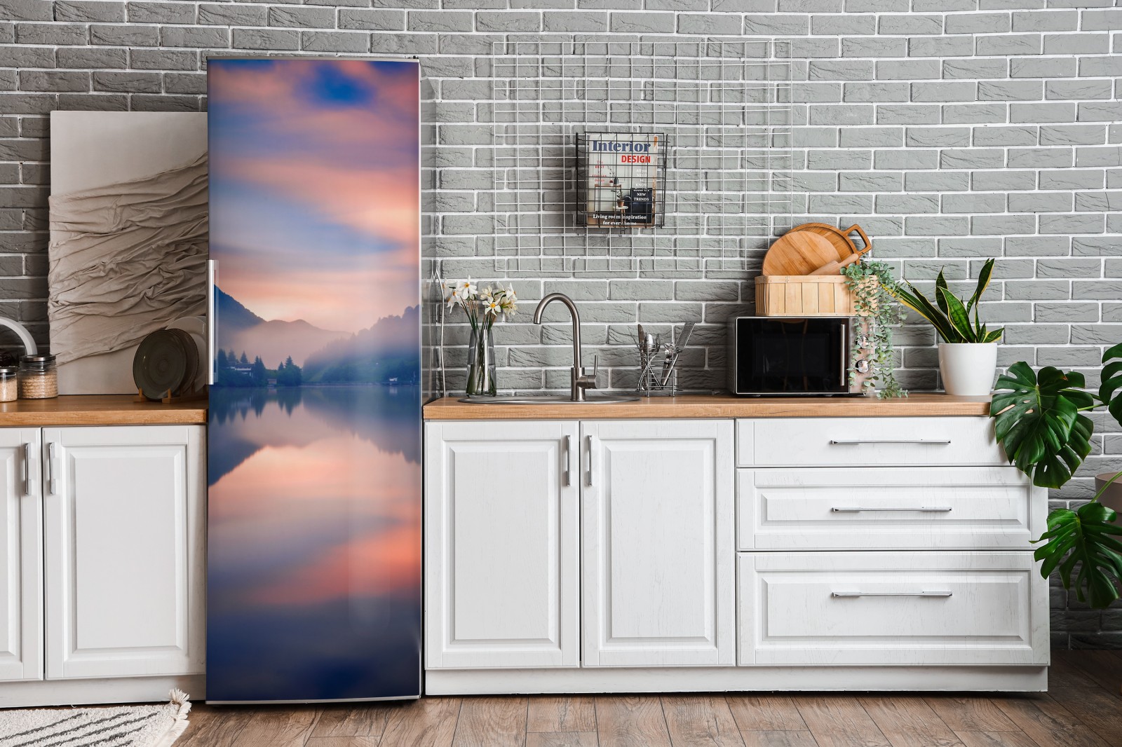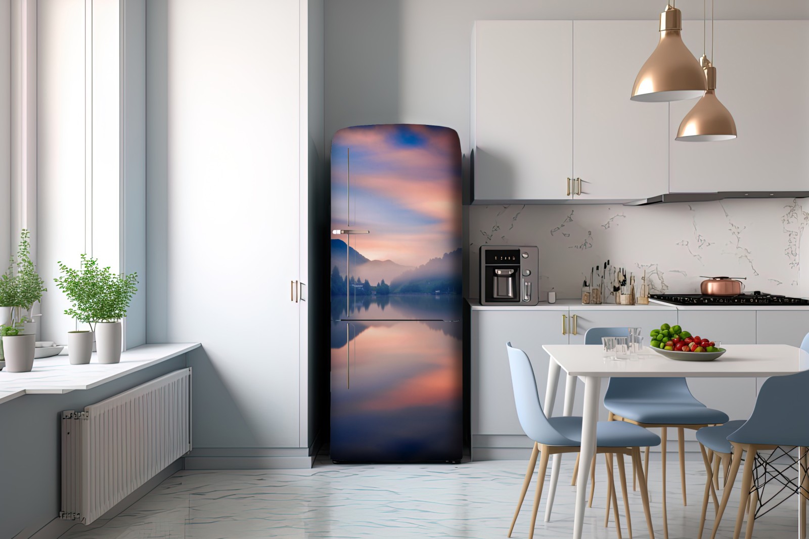 Kühlschrankaufkleber nebeliger bergsee bei dämmerung